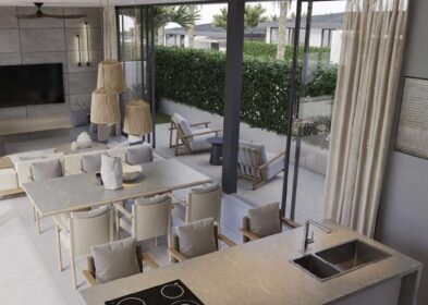 Sliding glass doors open directly to a private terrace and a 9m x 2.5m saltwater pool. A separate cabana with BBQ, cooking area, and lounge seating enhances the usability of the outdoor space.