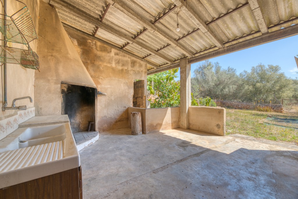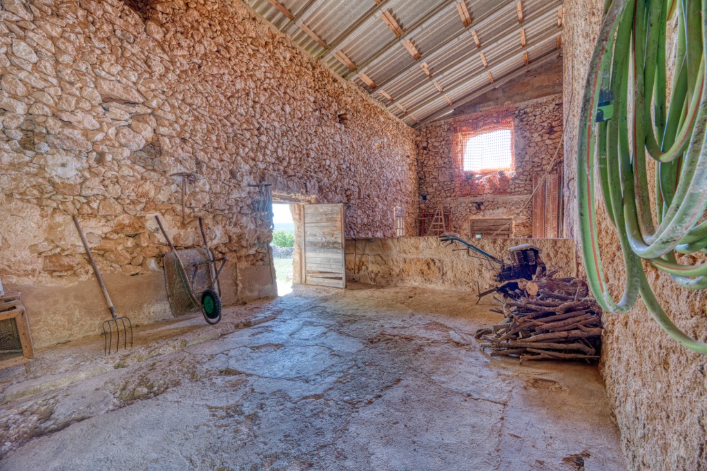On one side, a large wing has been configured as a workshop or warehouse with a separate rear patio, outdoor kitchen, wood oven and barbecue. The opposite wing includes a substantial barn space with loft and direct access to the land. A spacious roof terrace crowns the property, providing open views across the countryside toward Palma and the distant sea.