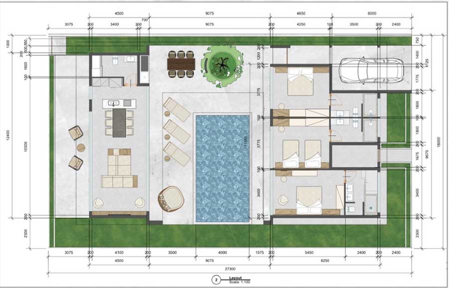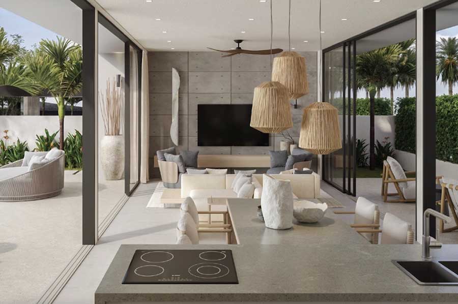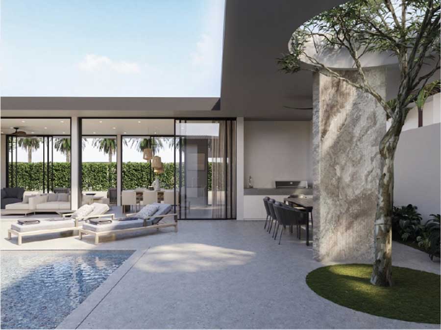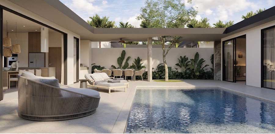 The villas are constructed to a high specification with premium fittings, full air conditioning, and quality materials sourced from international suppliers. The design merges tropical architecture with practical living — large glass panels maximise natural light while providing direct views over the pool and garden. The result is a bright, open interior that feels both luxurious and low-maintenance.