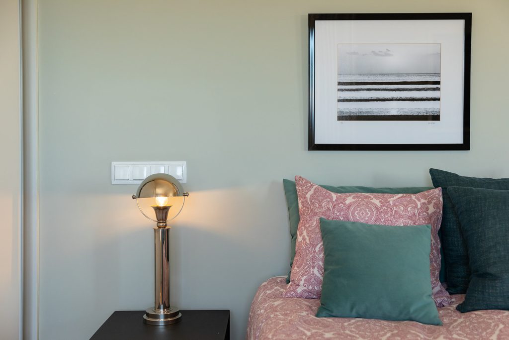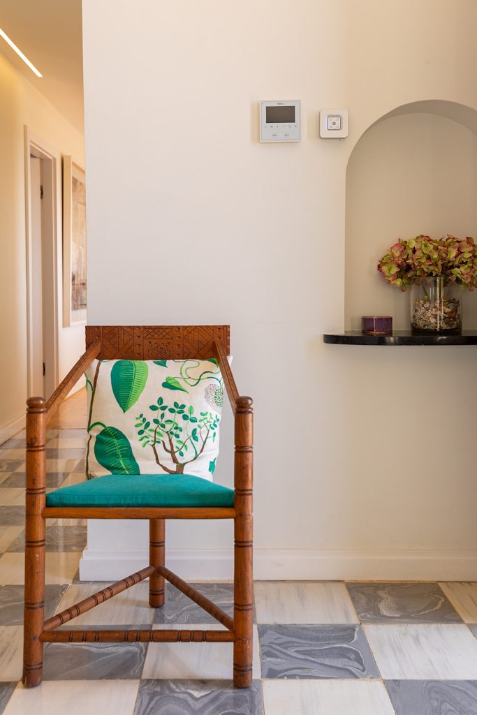 The main entrance opens into a generous hallway leading to a bright living room, where sliding doors connect directly to the terrace. An Art Deco influence can be seen in the design touches, balanced with modern finishes and abundant natural light. An adjoining room currently used as an office or TV lounge also benefits from sea views, and there is a guest toilet located off the hall.