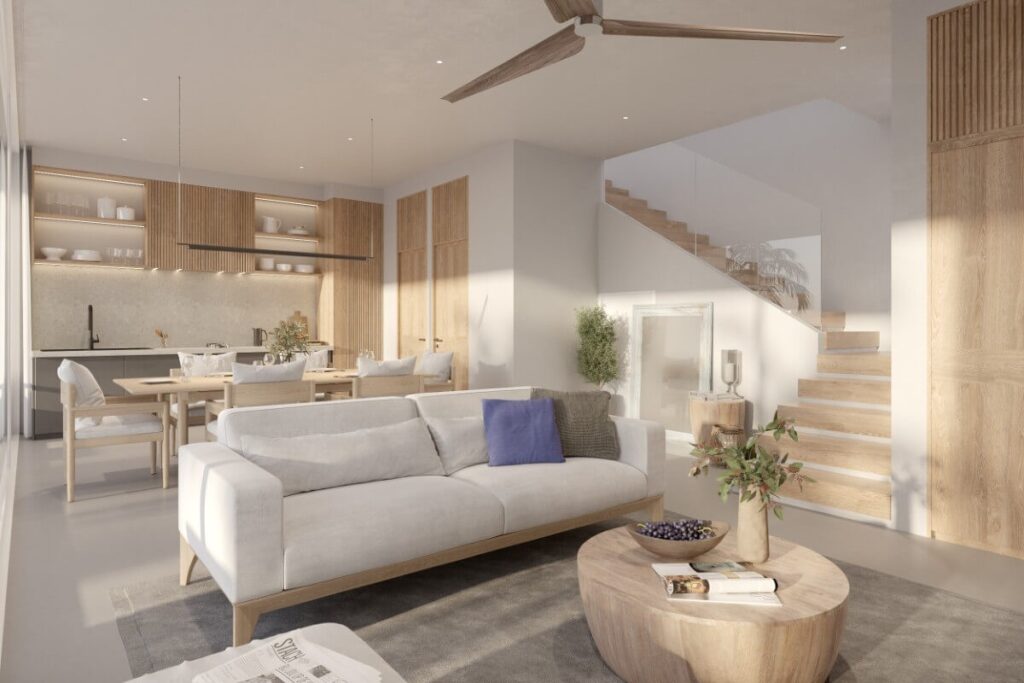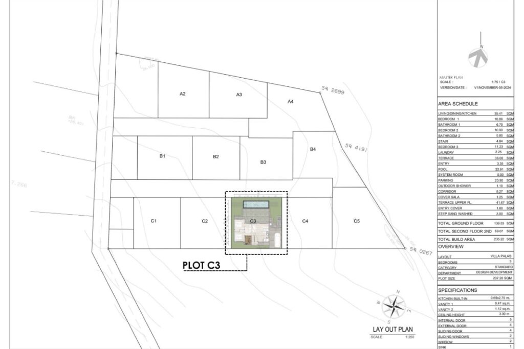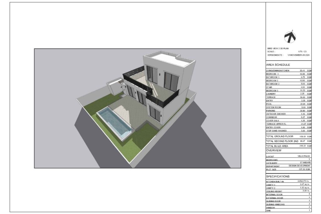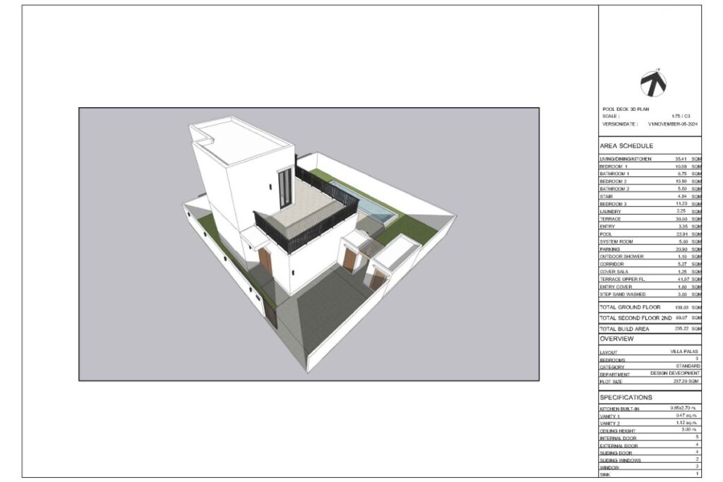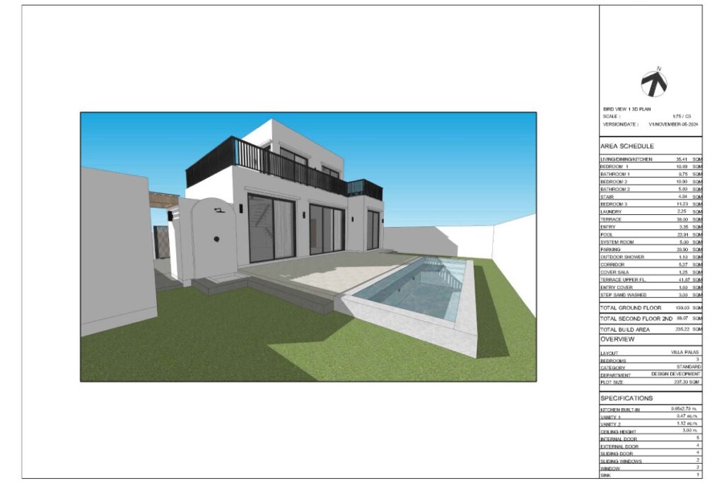 This resale 3-bedroom, 3-bathroom pool villa in Baan Manik is being sold by the owner and is currently under construction. The design takes a Mediterranean-inspired approach, combining minimalistic lines with a modern-rustic aesthetic, neutral colour palette, and wood accents that tie the interior to its tropical surroundings. The villa forms part of a sold-out gated estate of 13 pool villas ranging from 1 to 2 storeys and 2 to 3 bedrooms.