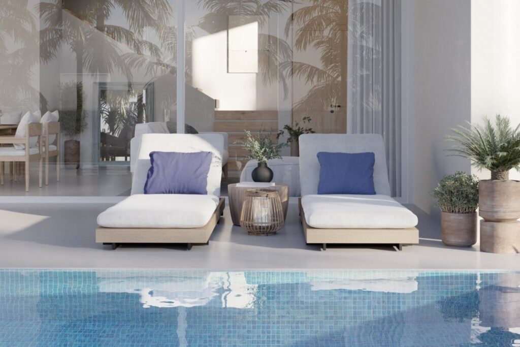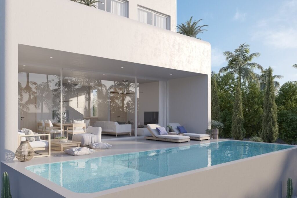 The ground floor accommodates two bedrooms with a shared bathroom alongside an open-plan living, dining, and kitchen area with direct access to the pool and patio. The master bedroom is on the upper floor and includes a private terrace of 42 sqm overlooking the swimming pool. The layout suits both full-time residential use and short or long-term rental investment.