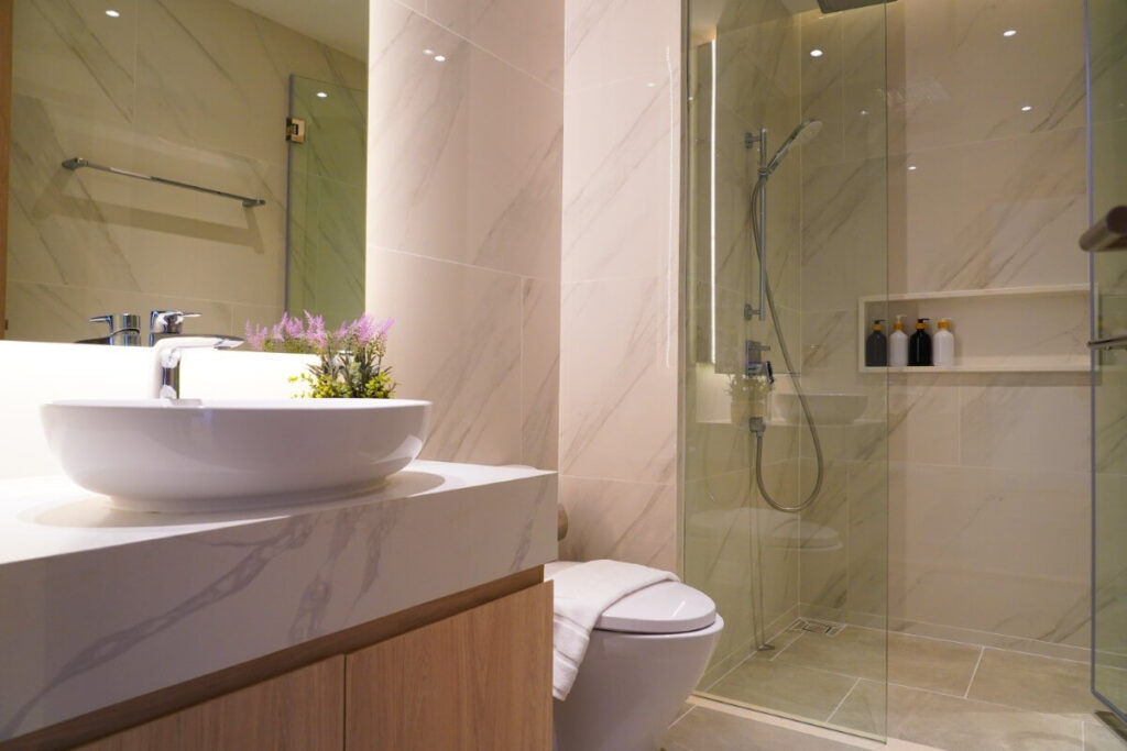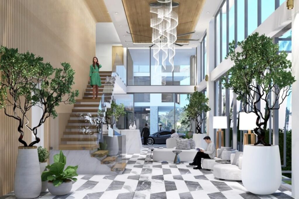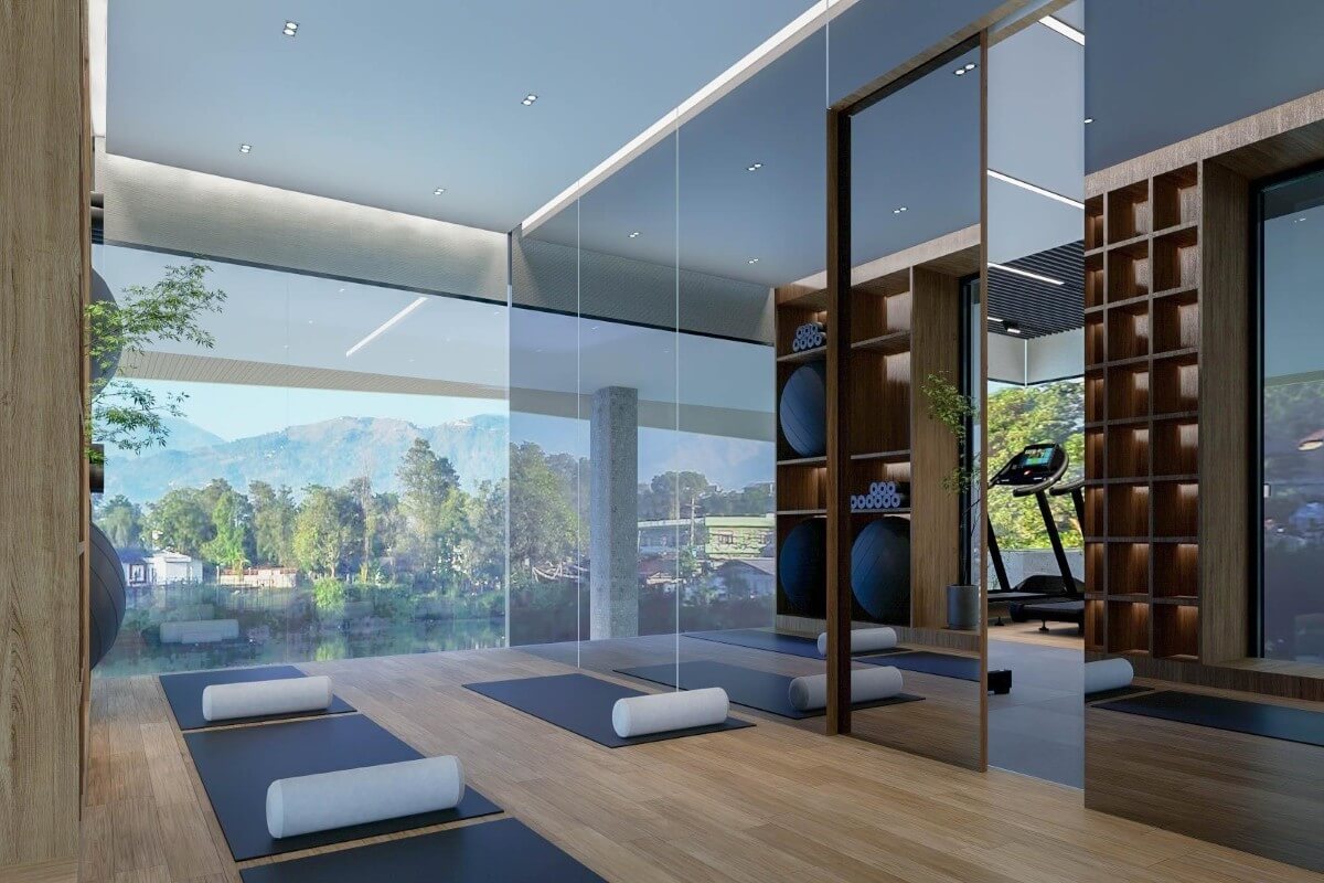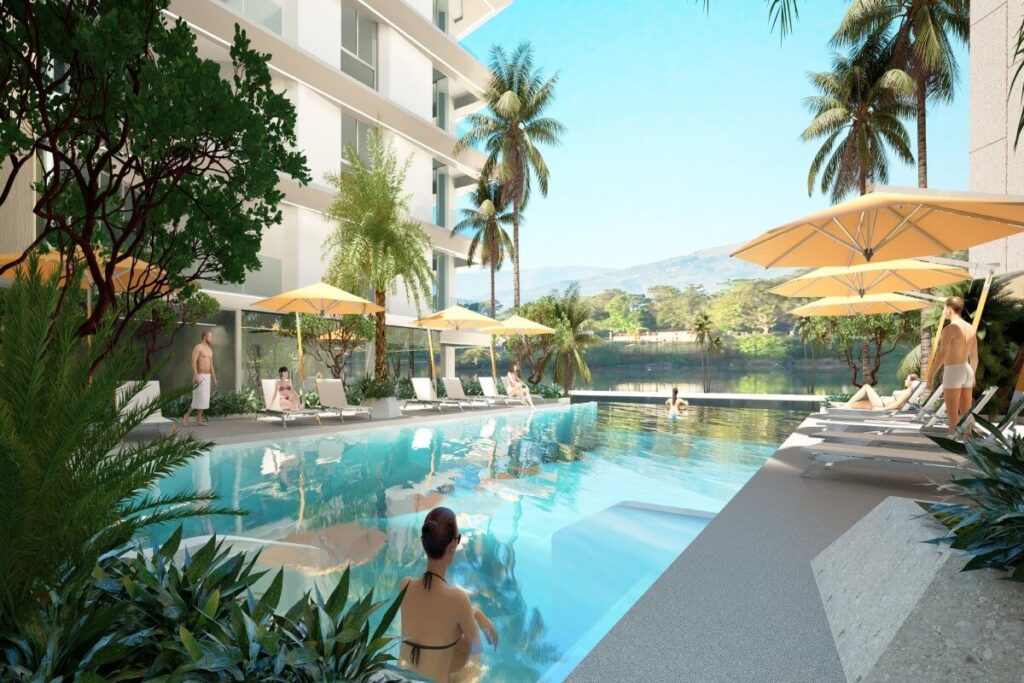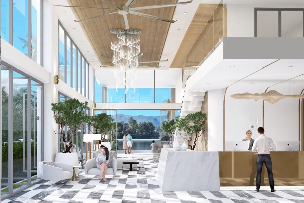 Units range from 1 to 3 bedrooms across sizes of 46 to 124 sqm. One-bedroom units run from 46 to 62 sqm, 2-bedroom units from 67 to 105 sqm, and 3-bedroom units from 100 to 123.76 sqm. The interiors follow a modern open-plan design with lake views, and units are available on a foreign freehold basis.