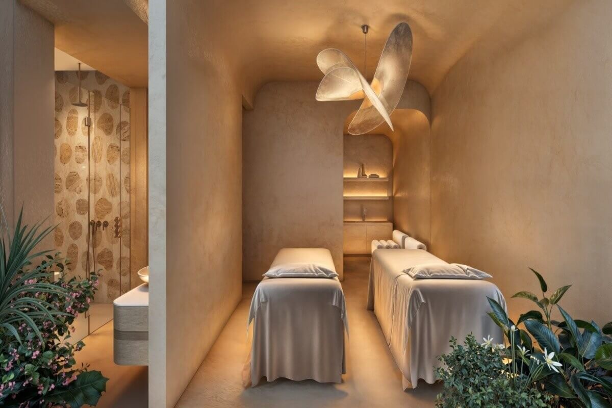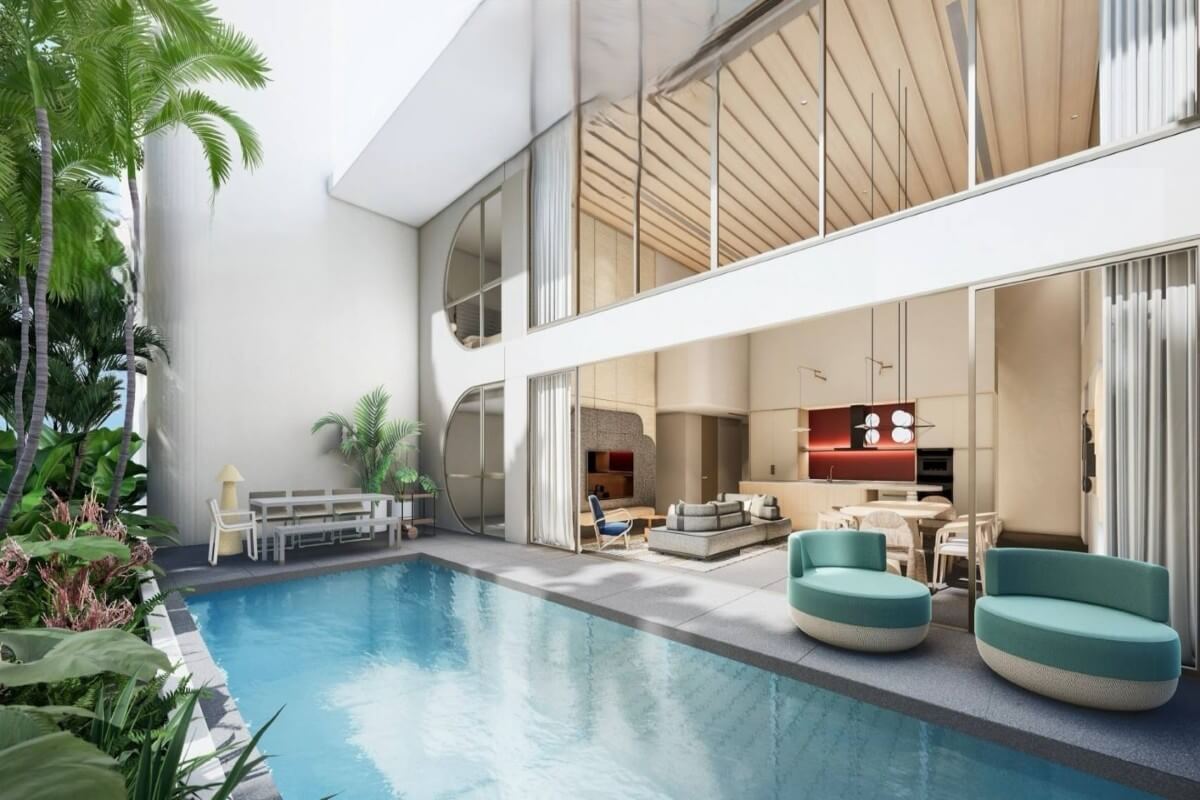 The lower floor of each duplex is arranged around an open-plan living and dining area, a fully equipped kitchen with service pantry, a multipurpose room, and maid’s quarters, all opening onto a private pool and outdoor terrace. The upper floor houses the master suite with walk-in wardrobe and an ensuite bathroom with soaking tub, plus views over the double-height living area below. Two further ensuite bedrooms complete the upper level.