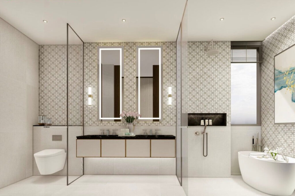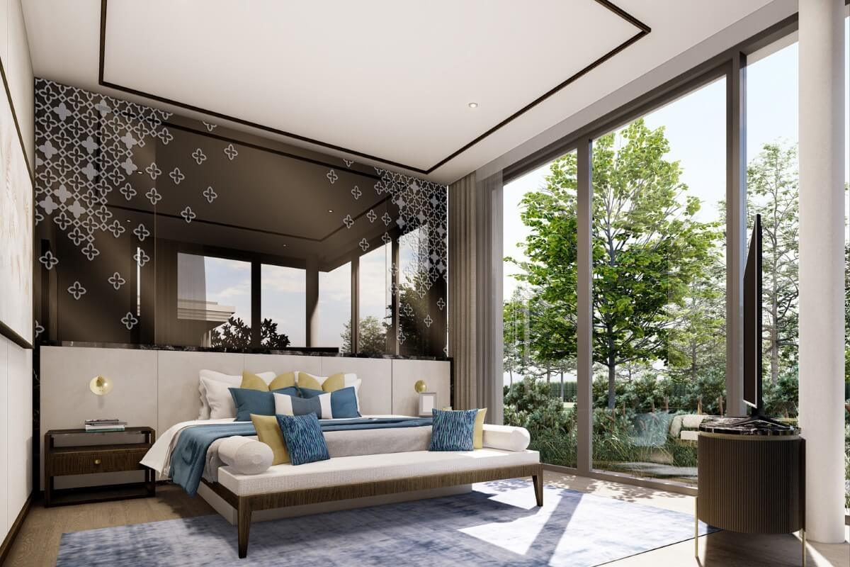 Each 3-bedroom villa has a built-up area of 285 sqm arranged in a U-shape around the swimming pool, with the main living, dining, and kitchen areas at the centre opening directly onto the pool terrace. Two bedrooms sit on opposite sides of the pool with both direct pool access and indoor access, while the third bedroom is positioned towards the rear and accessed from the interior. All bedrooms are ensuite. Each villa also includes a foyer, powder room, service terrace, laundry, and dedicated service areas.