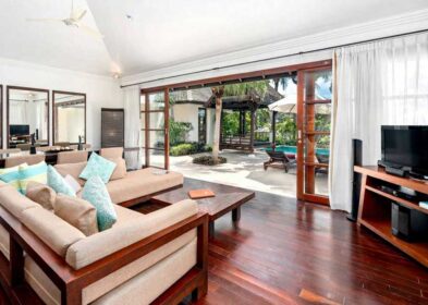 Upon entering the villa’s main level, you’ll find one of the three double en-suite bedrooms, providing both seclusion and easy access to the shared spaces. The core of this home is the open-plan living area, featuring a fully-equipped kitchen and a spacious living room that seamlessly extends to an alfresco dining and outdoor area. This level also includes a convenient guest bathroom and opens out to a private infinity pool, ideal for soaking up the sun while enjoying the stunning sea views.