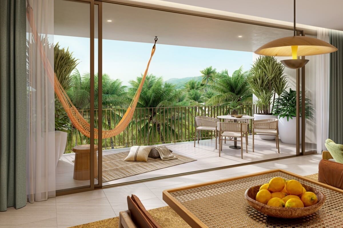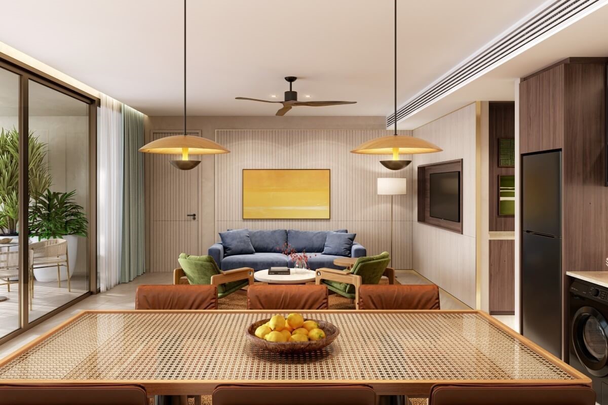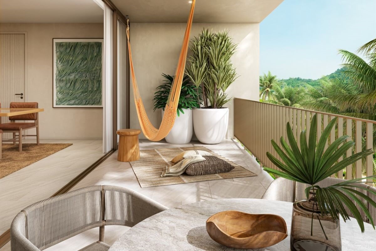The 1-bedroom units start at 60 to 70 sqm, notably larger than many comparable condos on the island. The 2-bedroom layouts run from 77 to 139 sqm, and the 3-bedroom units from 139 to 172 sqm, with multiple bathrooms and expansive living areas. All units feature open-plan living areas and oversized balconies and decks that create a strong indoor-outdoor connection. The development is pet-friendly, which remains a rare feature in the Phuket condo market.