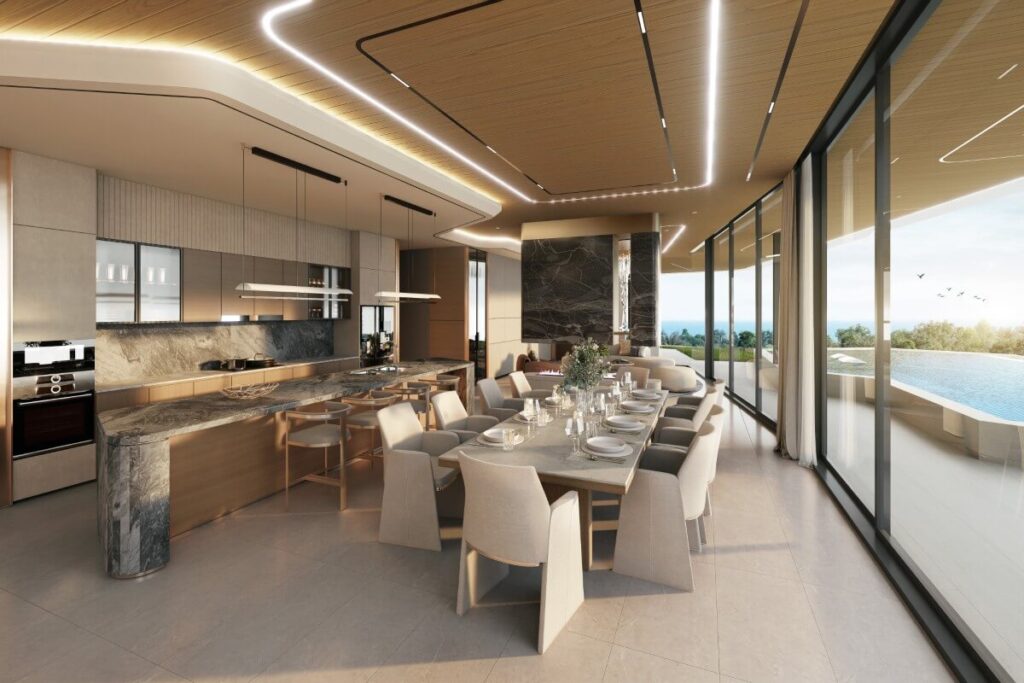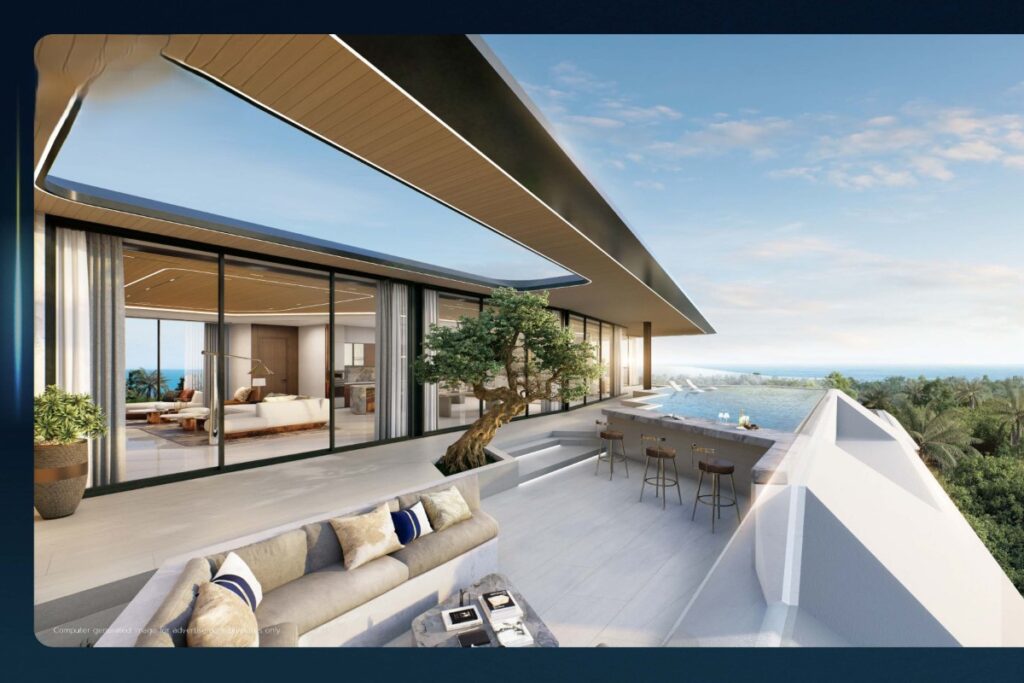 Each penthouse spans 692 sqm and comes fully furnished, with open-plan layouts, premium finishes, and full-height glass panels creating bright interiors with panoramic views. The master suite includes a spa-inspired bathroom and walk-in wardrobe, with three further bedrooms providing space and privacy for family or guests. Expansive balconies and a deck extend the living space outdoors, and integrated smart home systems are fitted throughout.