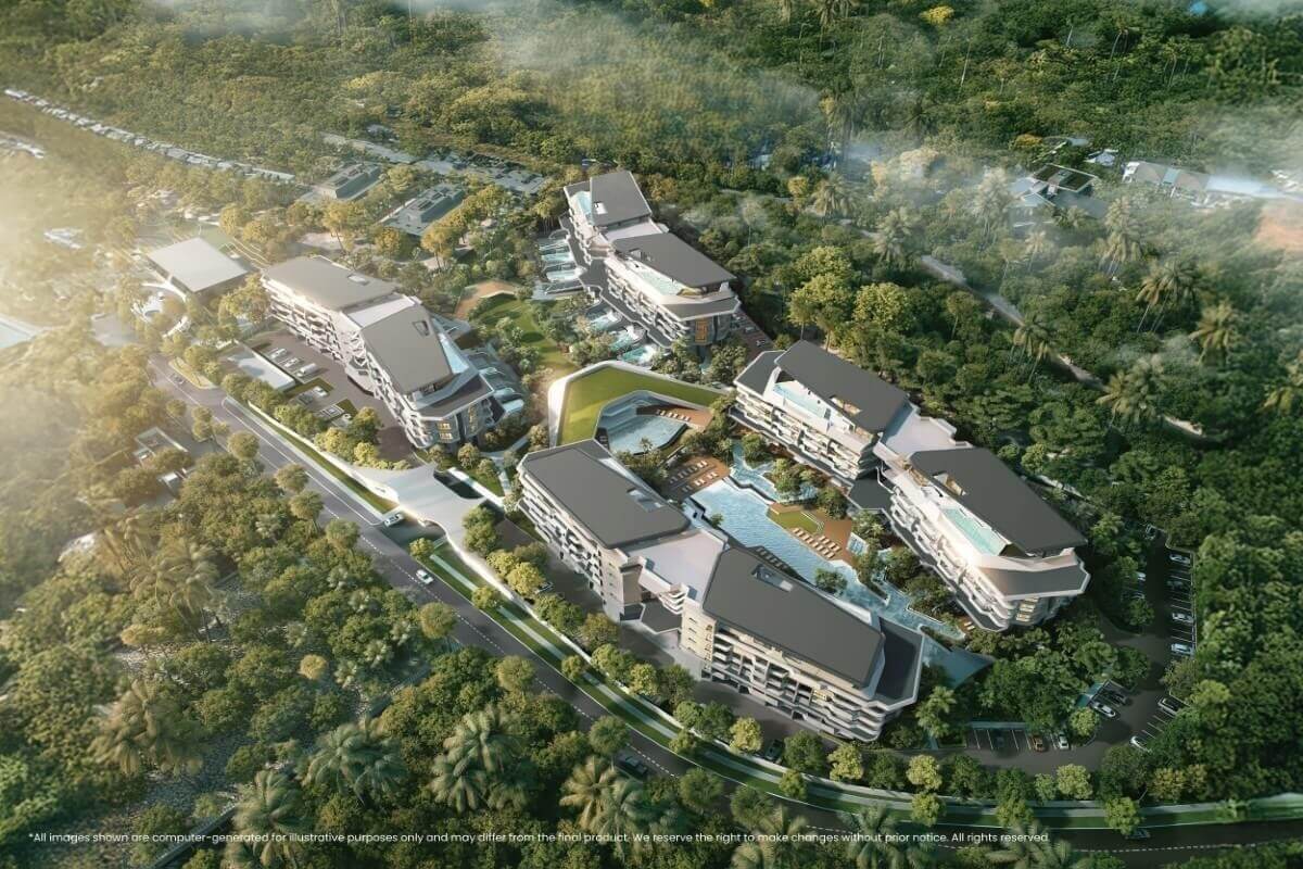 The wider development offers 1, 2, and 3-bedroom layouts alongside duplex units and these 4-bedroom penthouses, with private pools measuring up to 16 by 4 metres. Floor areas across the project range from 59.52 sqm to 713.53 sqm, all available on a foreign freehold basis.