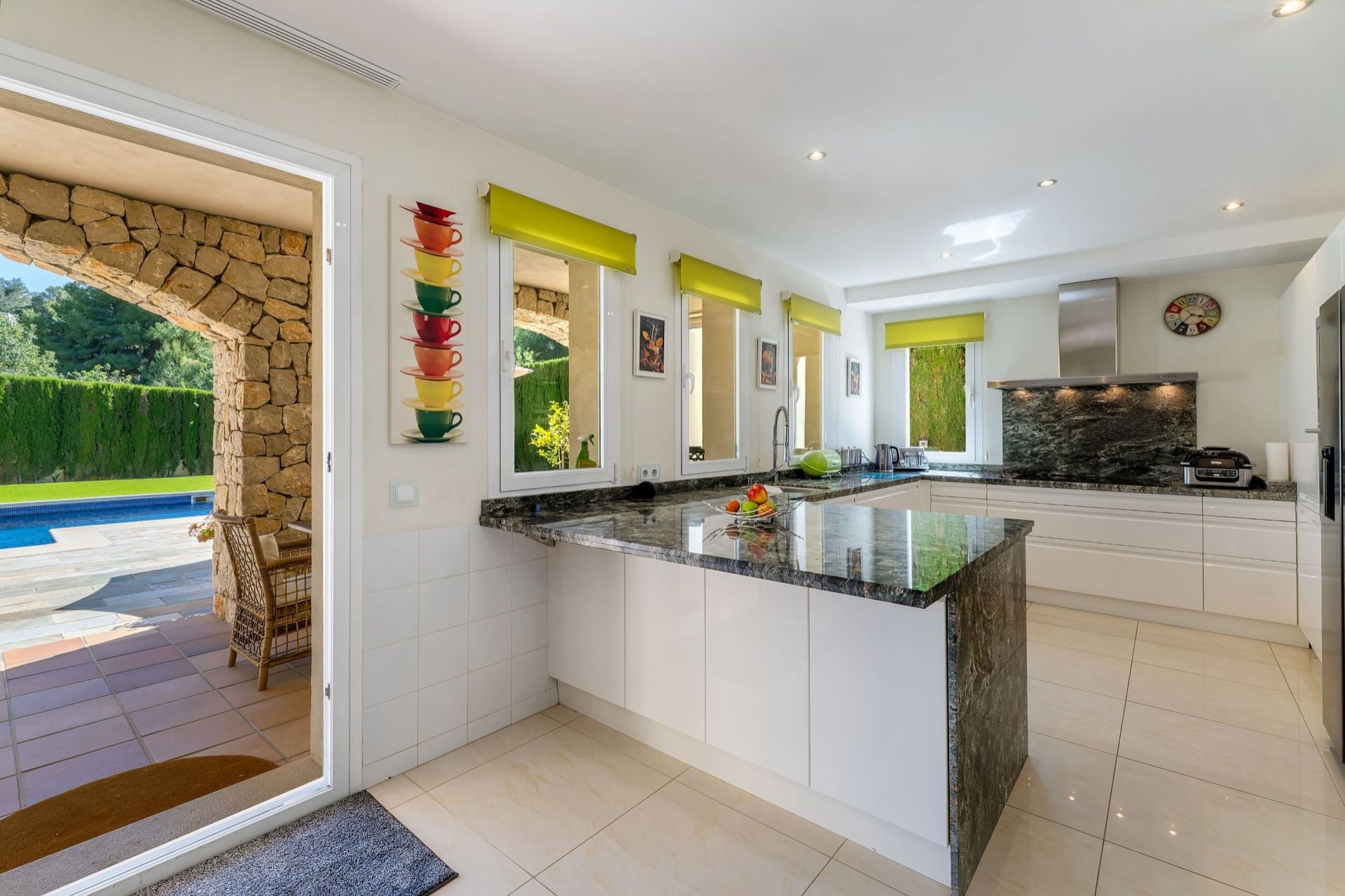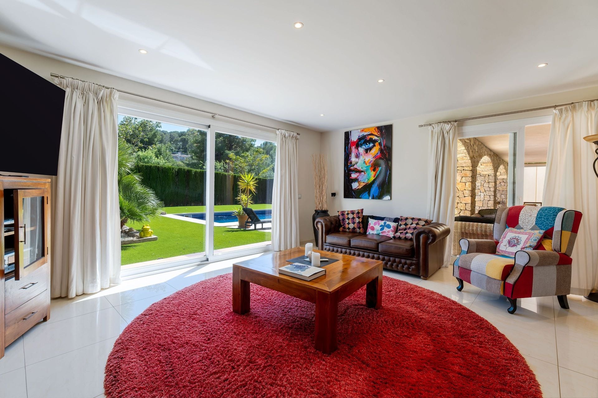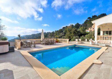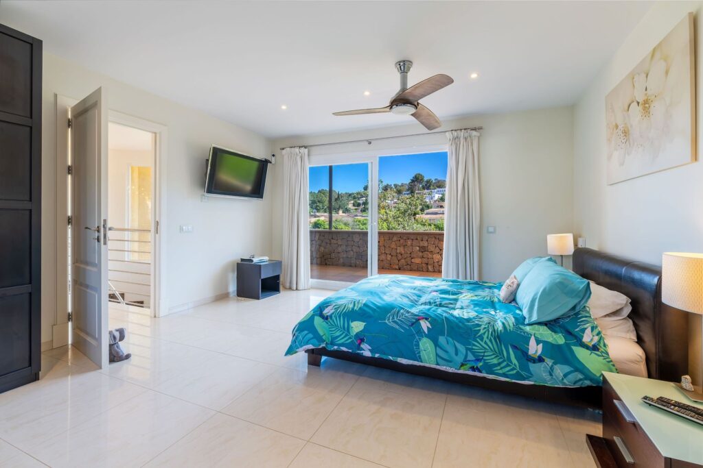 There are four bedrooms, one of which is currently used as a dedicated office, and four bathrooms. A covered porch of around 33 sqm bridges the indoor and outdoor spaces. The motorway is two minutes away, Palma airport is approximately 25 minutes by car, and Palma city centre is around 20 minutes. The nearest beach is three minutes away, and the Santa Ponsa golf courses are within a ten-minute drive. International schools including Baleares International College and Agora Portals are within 10 to 15 minutes.