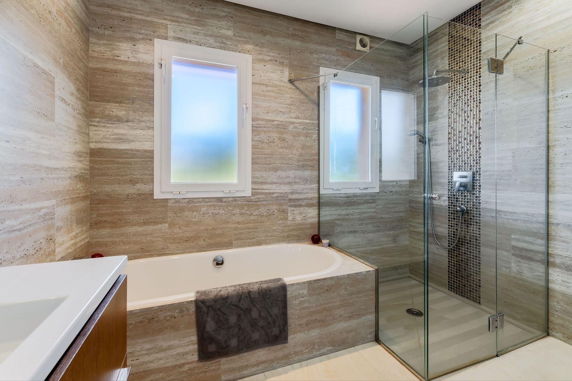 The total constructed area is 368 sqm, with 198 sqm of interior living space distributed across two levels. Double cavity walls give the structure strong insulation credentials, and the technical fit-out is geared for year-round use – underfloor heating, full air conditioning and a log burner fireplace in the main living area cover all seasons. Solar panels have also been installed. Large windows on all sides of the building keep the interior well connected to the garden and greenery outside. A separate utility room, a 40 sqm storage space and a garage for two cars add to the practical layout.