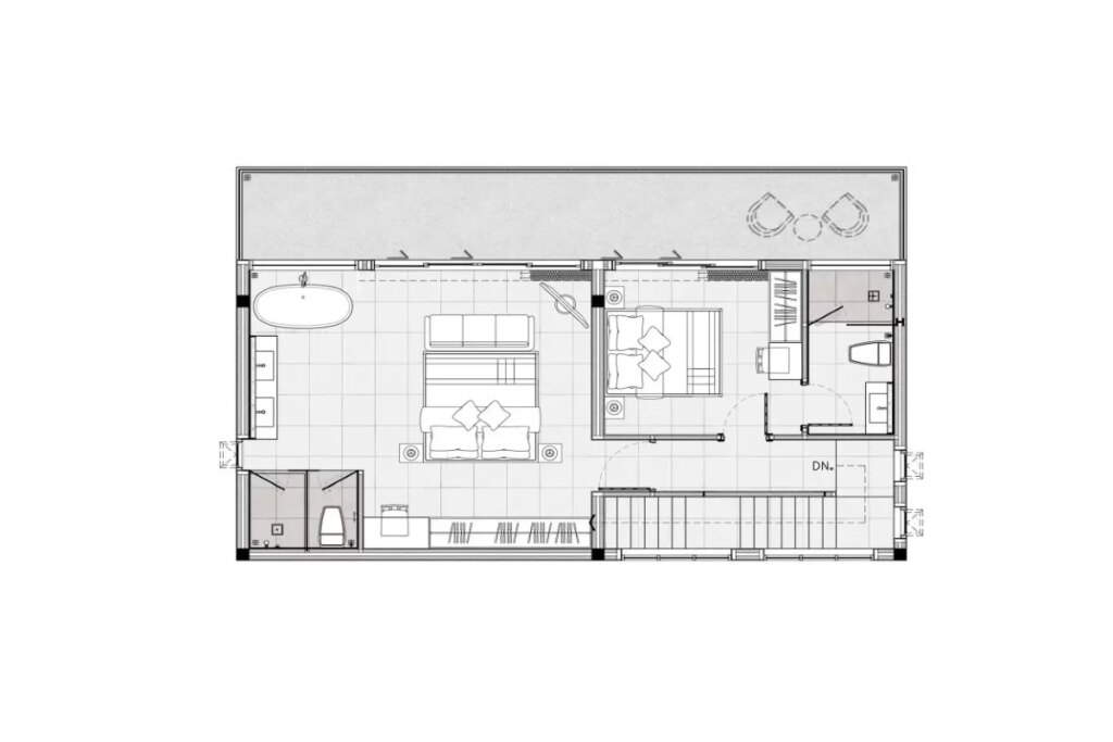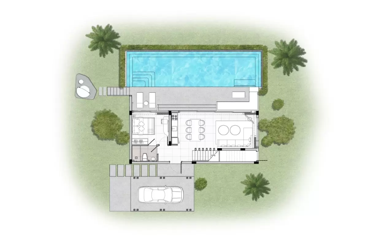 The design takes a modern tropical approach, combining Scandinavian-inspired minimalism with cream-white tones and light wooden accents throughout. The 299 sqm build is arranged across two levels on a 364 sqm plot. On the ground floor, floor-to-ceiling sliding glass doors open from the open-plan living, dining, and kitchen area directly onto the pool terrace, which features a sunken lounge and a private swimming pool running along the full length of the villa. A ground floor bedroom shares a bathroom with the living area, and covered parking for one car is also on this level.