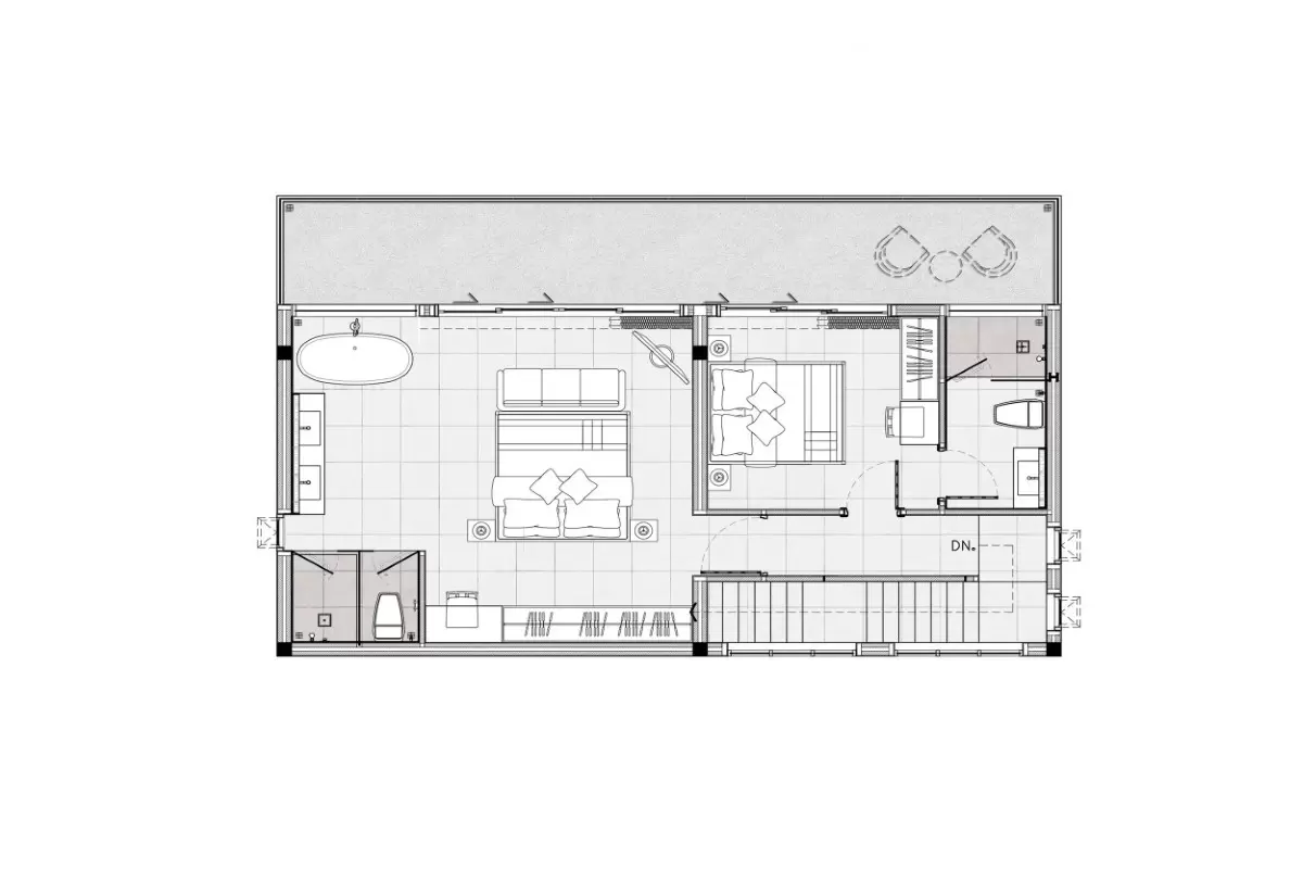 The upper floor has two ensuite bedrooms, both sharing a full-width terrace. The master bedroom includes a bathtub. A shared pool and fitness centre are also available within the development.