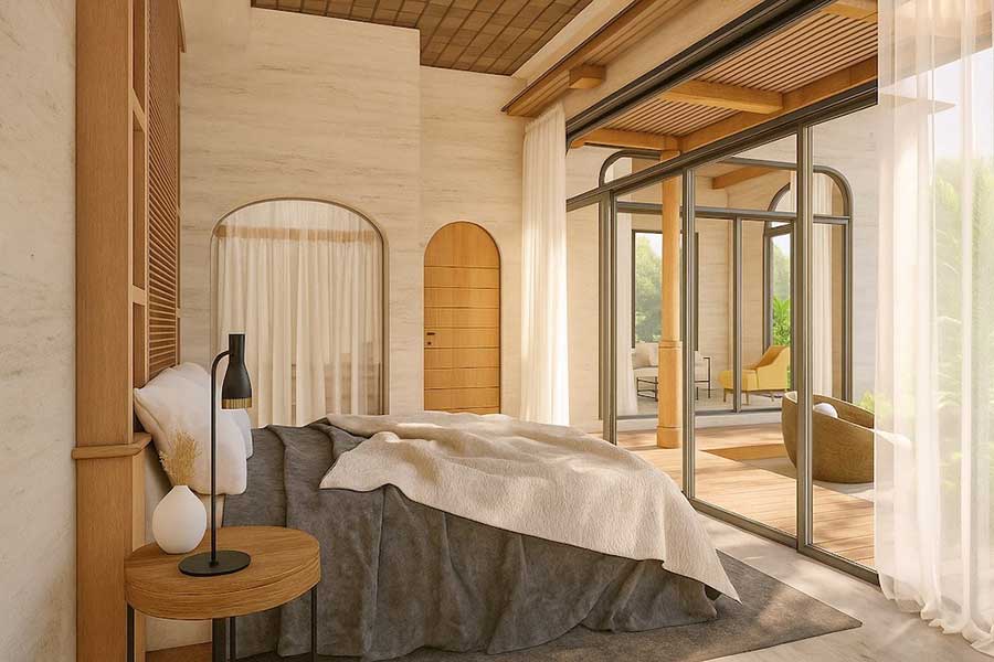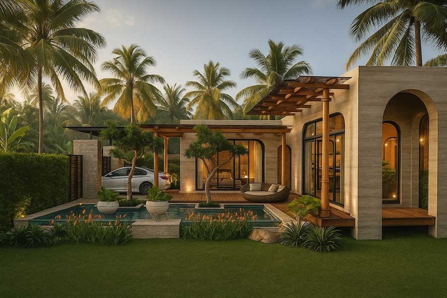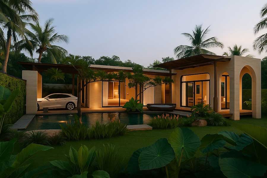 A private swimming pool forms the focal point of the villa’s layout, complemented by sun terraces and covered patio areas that invite both relaxation and entertaining. Attention to detail is evident in the choice of materials—stone, timber, and smooth plasterwork—balancing comfort with durability in the tropical climate.