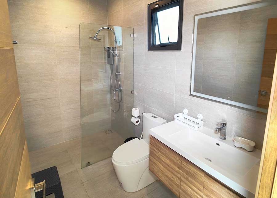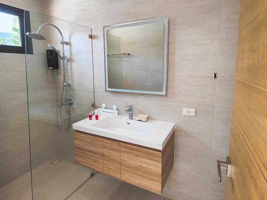 The internal layout includes two ensuite bedrooms and a total of three bathrooms. Both bedrooms are positioned to overlook the surrounding mountain landscape, providing an open outlook while maintaining privacy. The single-level configuration removes the need for internal stairs, supporting straightforward day-to-day use and easy circulation throughout the villa.
