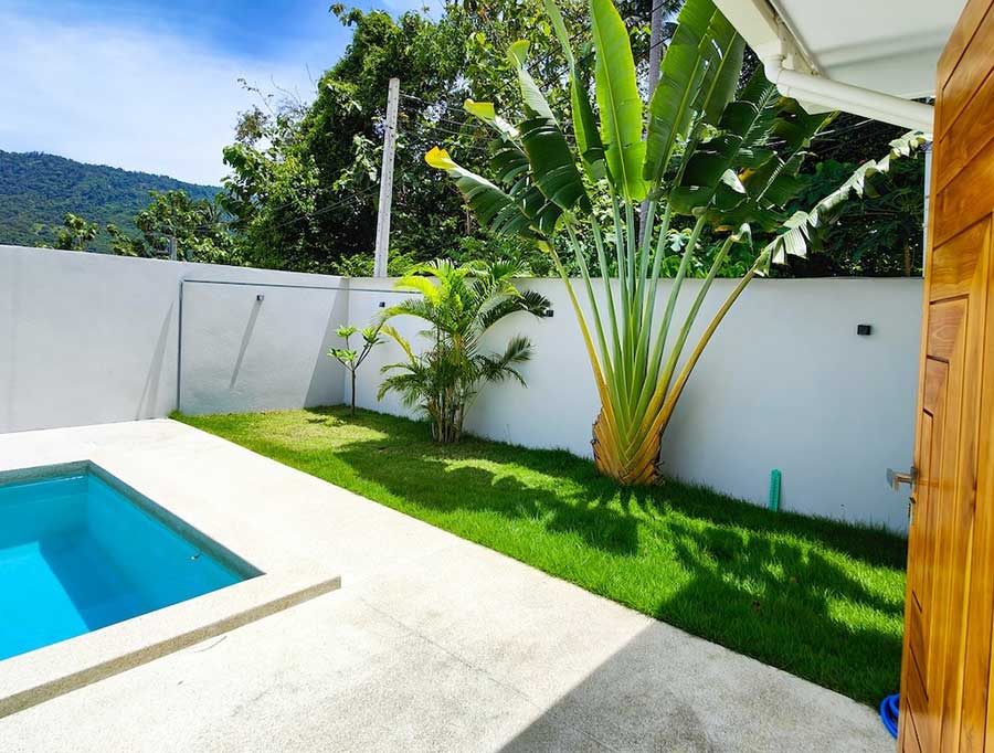 Completed in 2023, this Contemporary Asian 2-bed garden pool villa is for sale in a small complex position, just a short drive from Lamai Beach. The villa is arranged as a single-storey home with a total living area of 98 sqm, set on a 303 sqm land plot within a quiet residential setting.