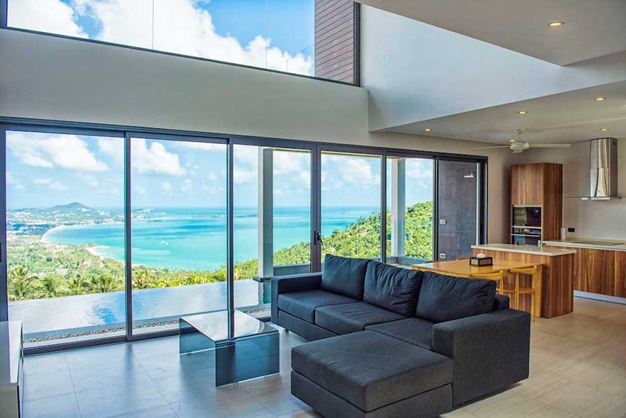 The private pool is positioned alongside two terraces, providing separate areas for seating and outdoor use. From these areas, the villa enjoys open sea views across Chaweng Bay and the surrounding coastline. The property is described as having a contemporary Asian design, with the structure and finishes intended to suit its hillside setting.