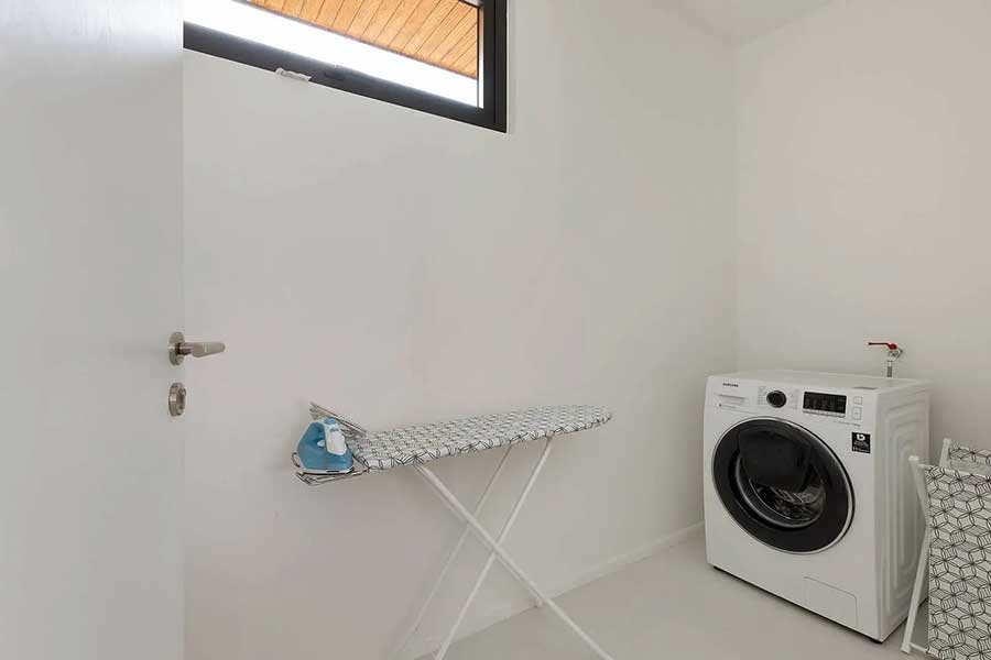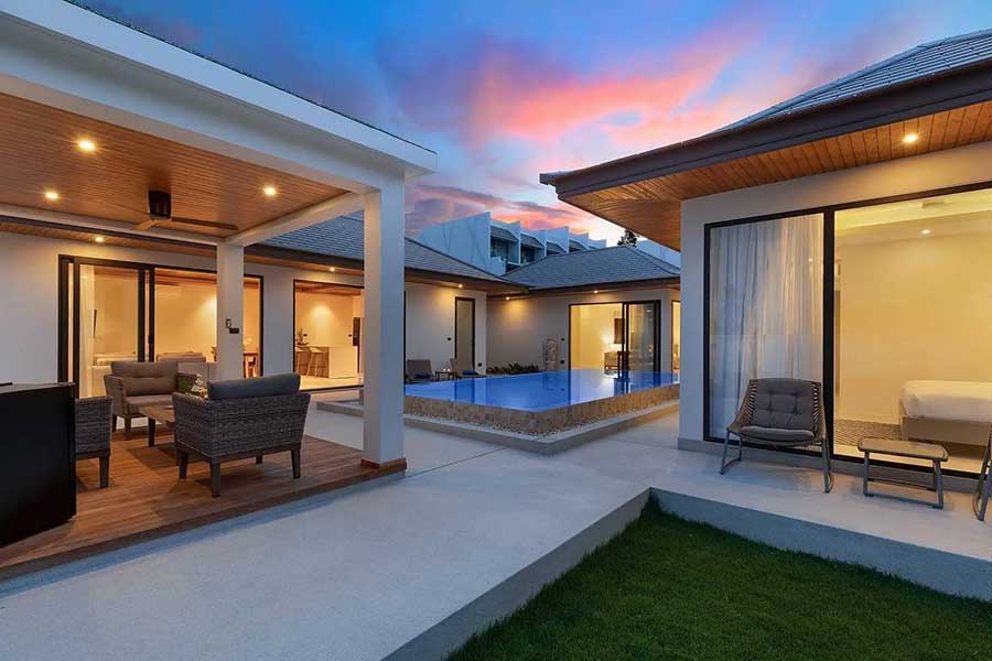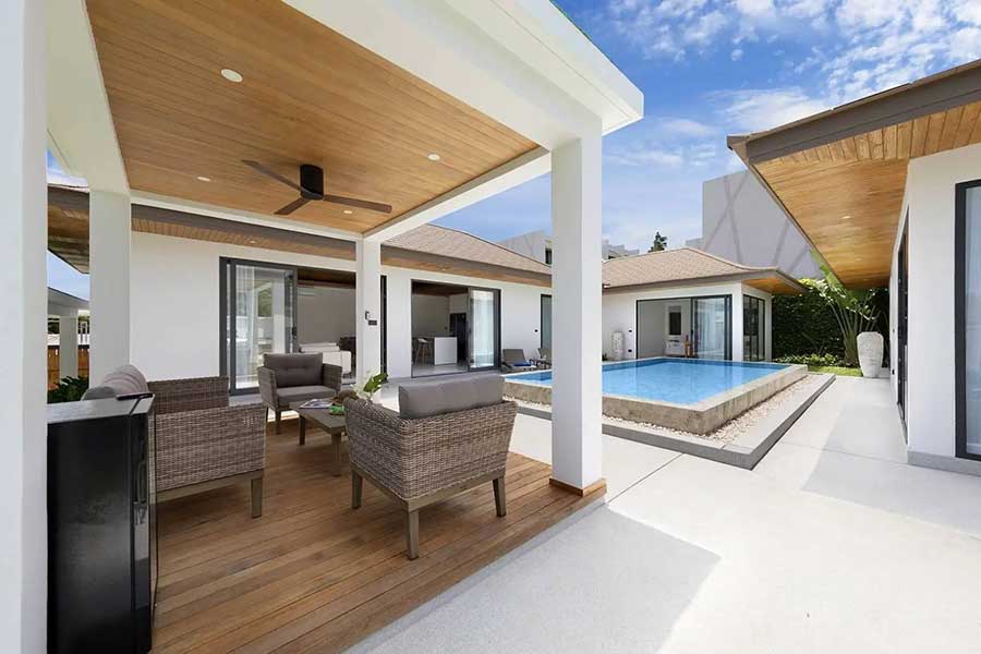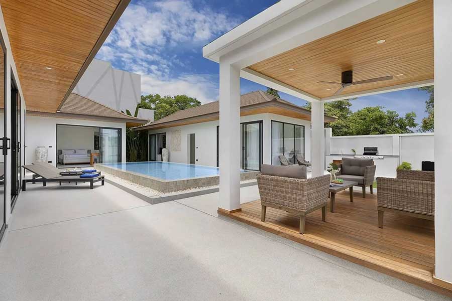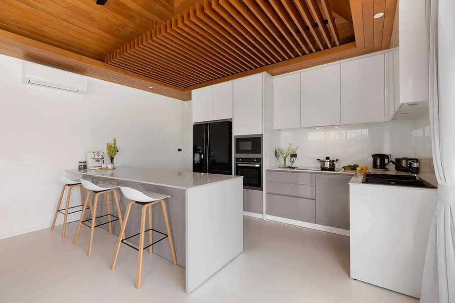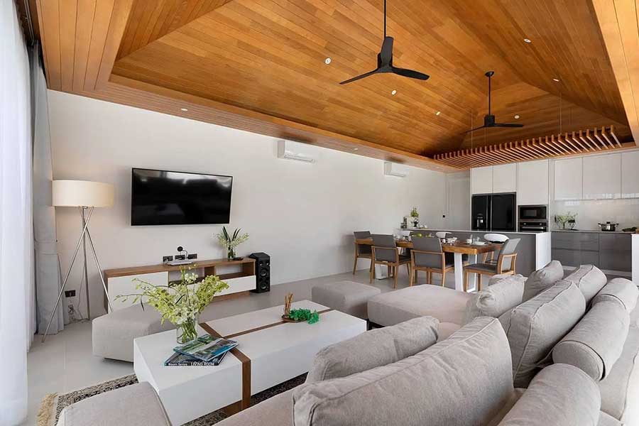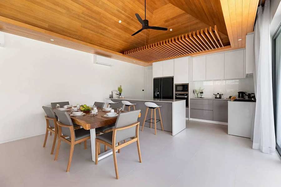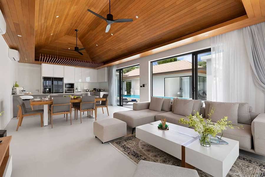 The villa is arranged across three separate pavilions positioned around a private 8-metre swimming pool, creating a layout that emphasises privacy and indoor–outdoor living. One pavilion houses the main open-plan living area, featuring a timber ceiling and generous lounge space, along with a European-style kitchen. The kitchen is fully equipped and includes a pantry room and washing machine, supporting everyday living as well as longer stays.