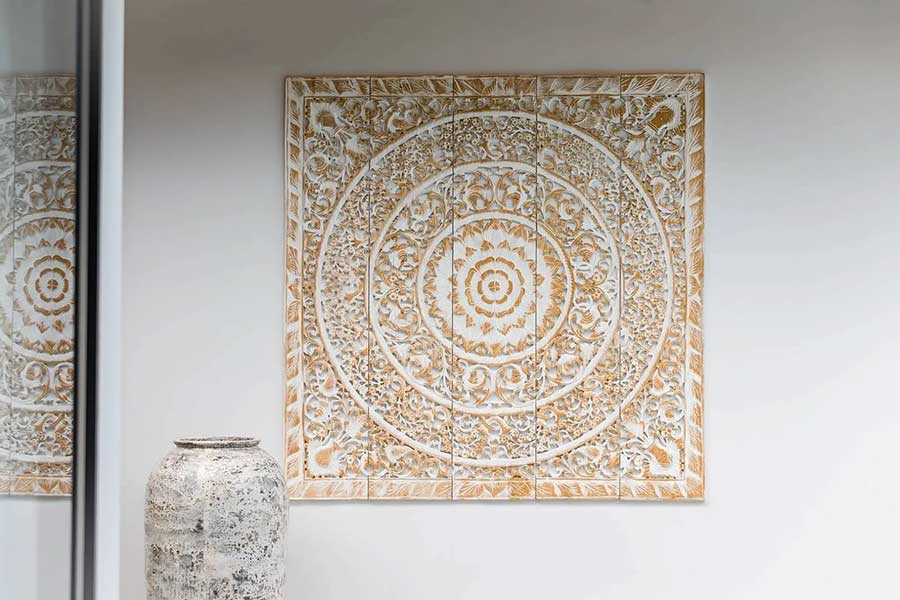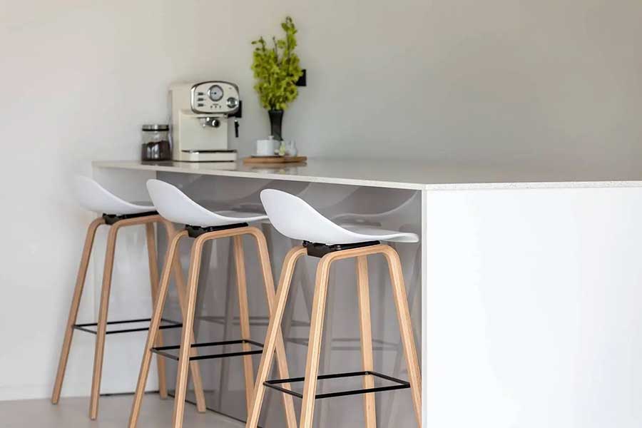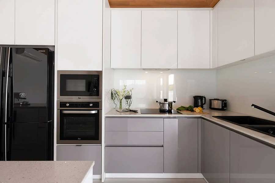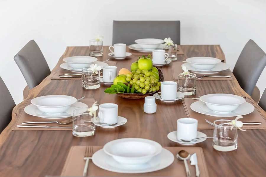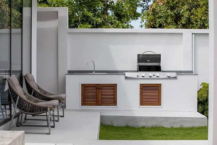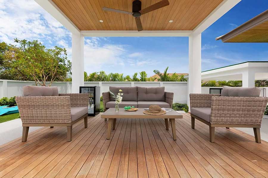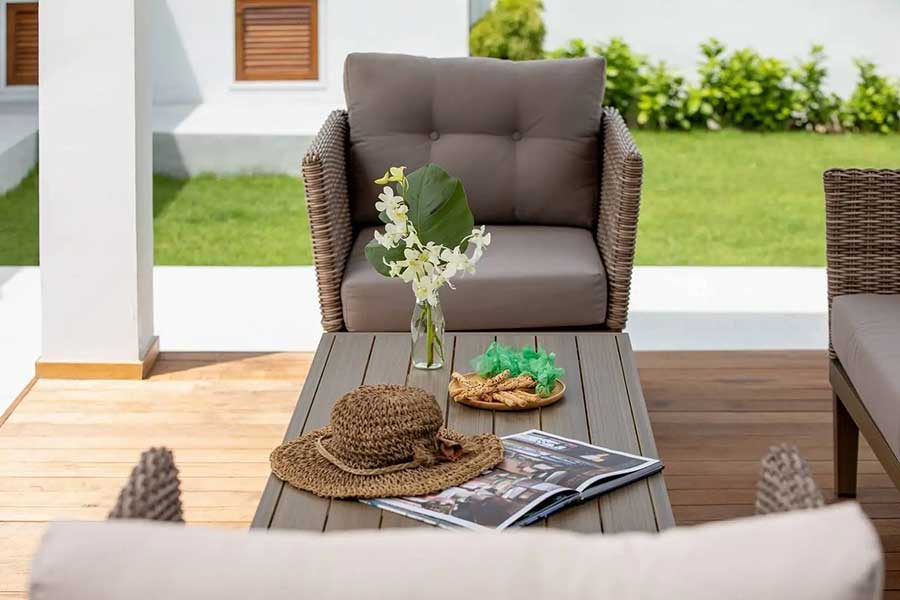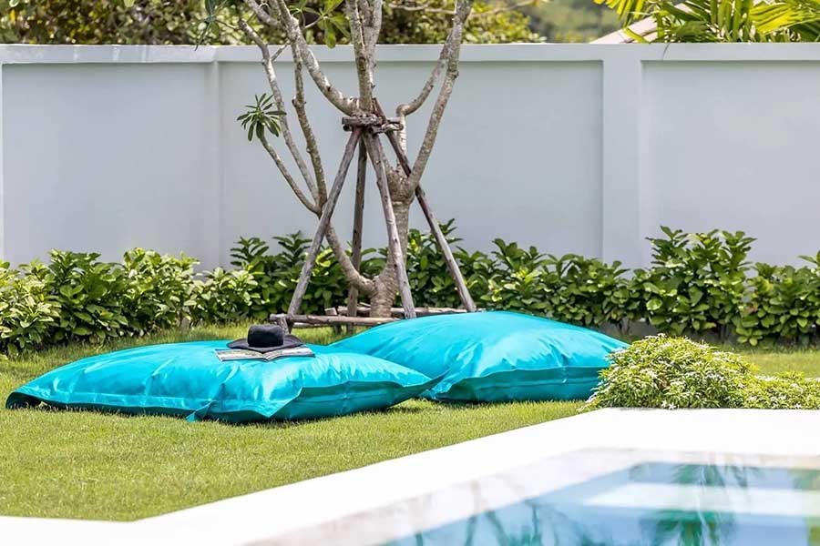 The villa is arranged across three separate pavilions positioned around a private 8-metre swimming pool, creating a layout that emphasises privacy and indoor–outdoor living. One pavilion houses the main open-plan living area, featuring a timber ceiling and generous lounge space, along with a European-style kitchen. The kitchen is fully equipped and includes a pantry room and washing machine, supporting everyday living as well as longer stays.