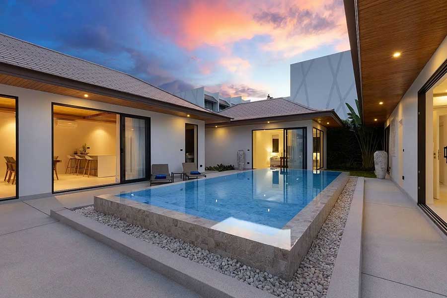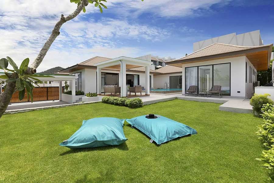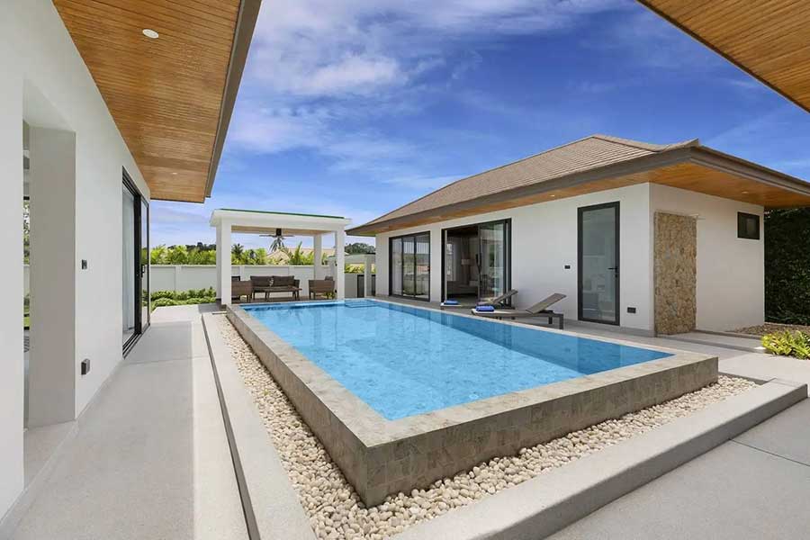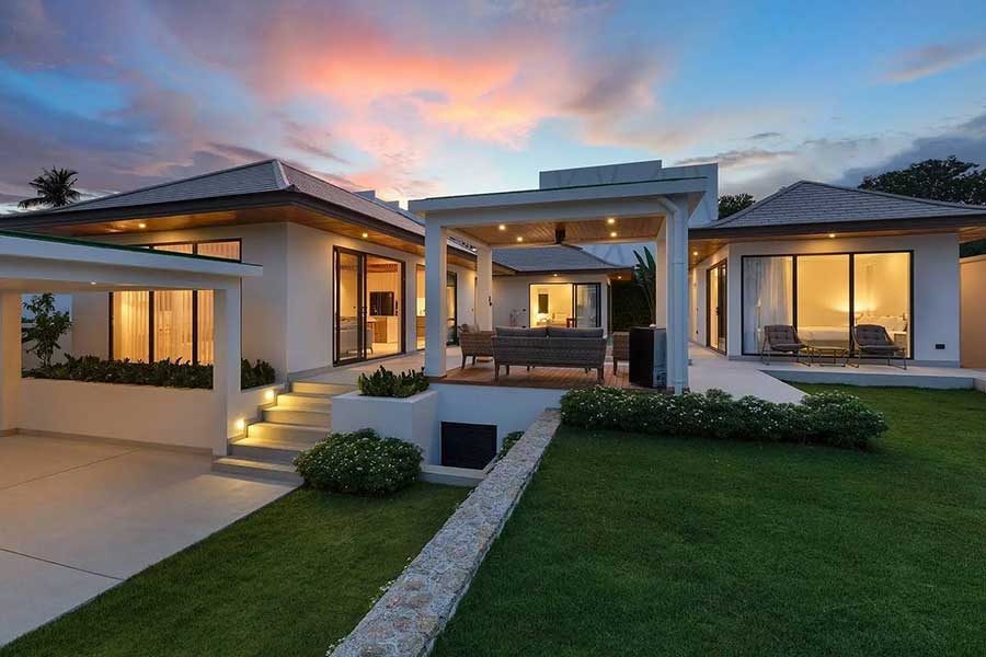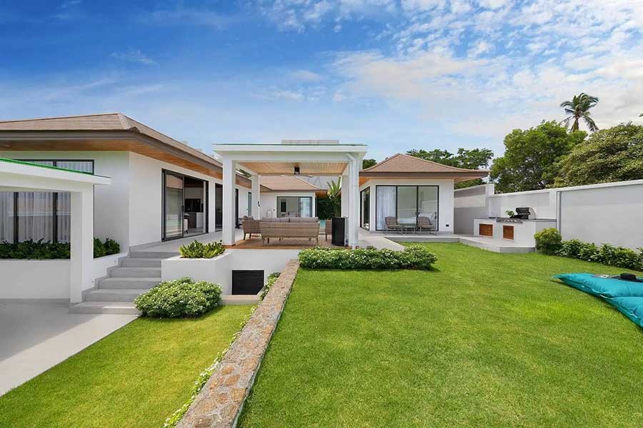 Offered for sale, brand-new and beautifully finished, this striking single-level contemporary Bali-style garden pool villa enjoys a premium location within a secure gated estate just 400 metres from Choeng Mon Beach in north-east Koh Samui.