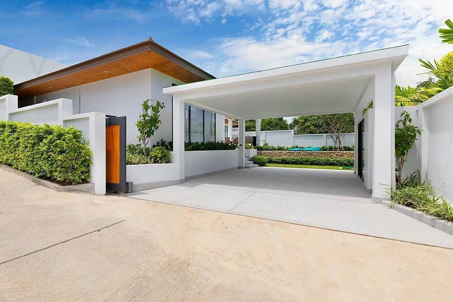 Set on a land plot of approximately 600 sqm, the property is surrounded by a generously sized landscaped garden. A mature Frangipani (Plumeria) tree provides natural shade, contributing to the established feel of the outdoor space. The villa also includes a covered carport for one vehicle, accessed via automatic gates.