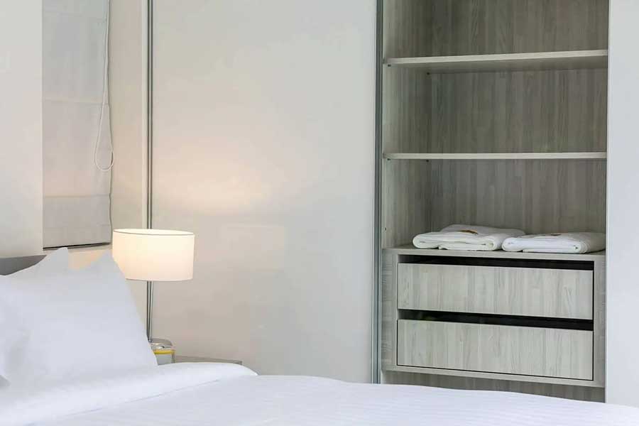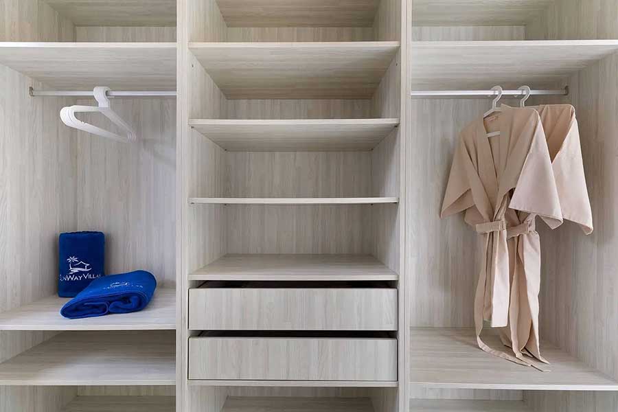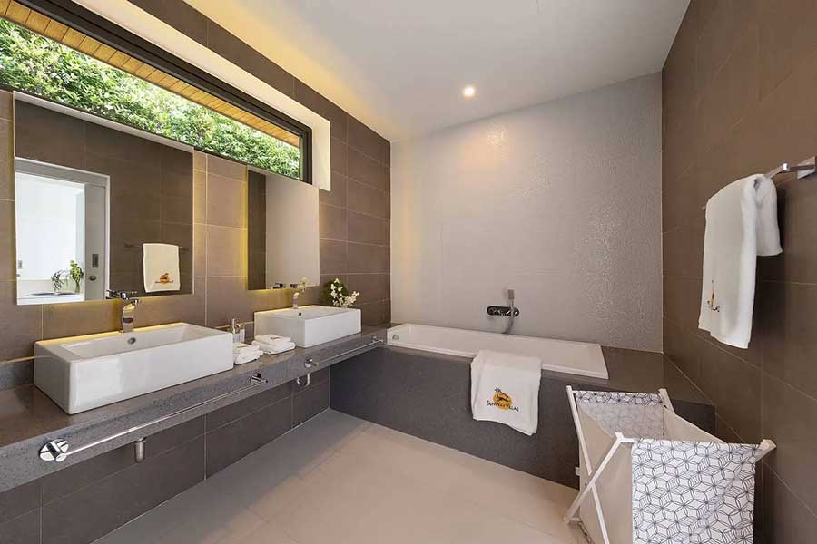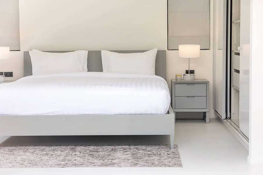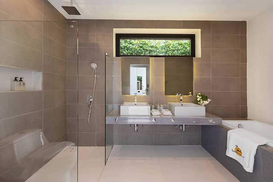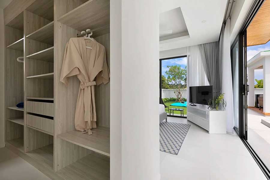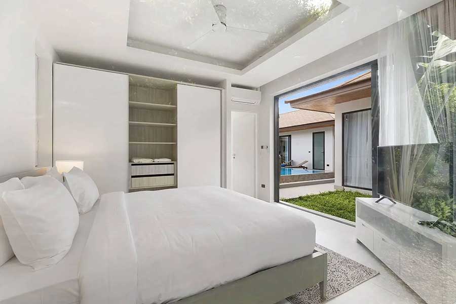 A second pavilion accommodates two bedrooms, each with built-in wardrobes and en suite bathrooms with showers. The third pavilion is dedicated entirely to the main bedroom, which includes a spacious en suite bathroom fitted with a bathtub. In total, the villa provides three bedrooms and four bathrooms, all arranged on a single level.
