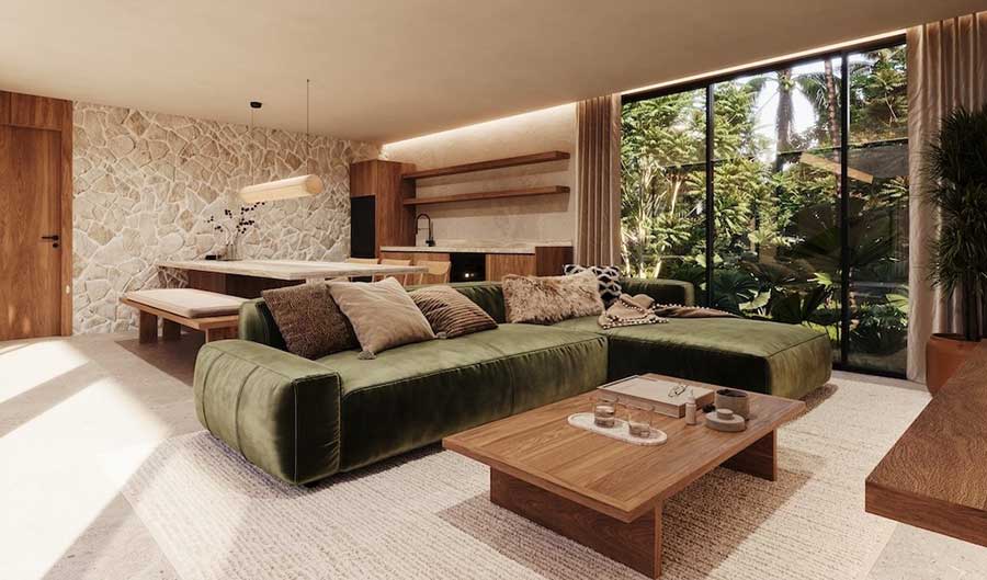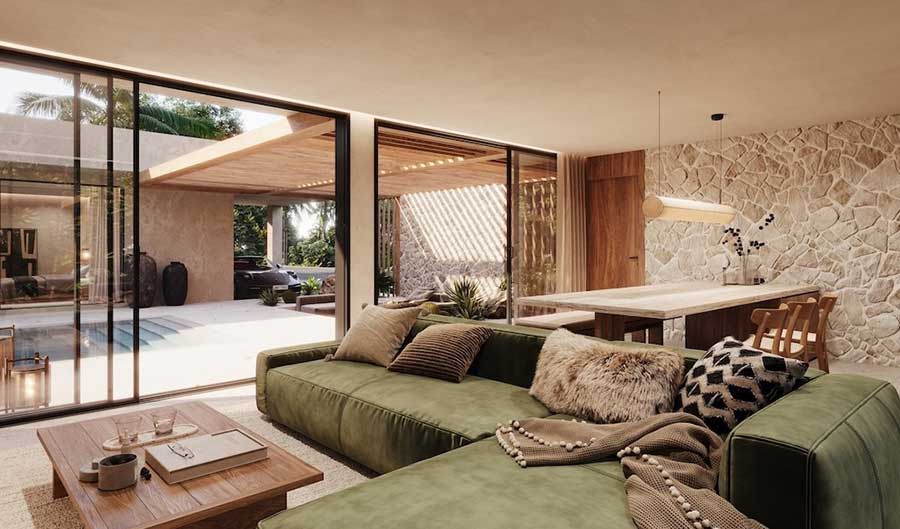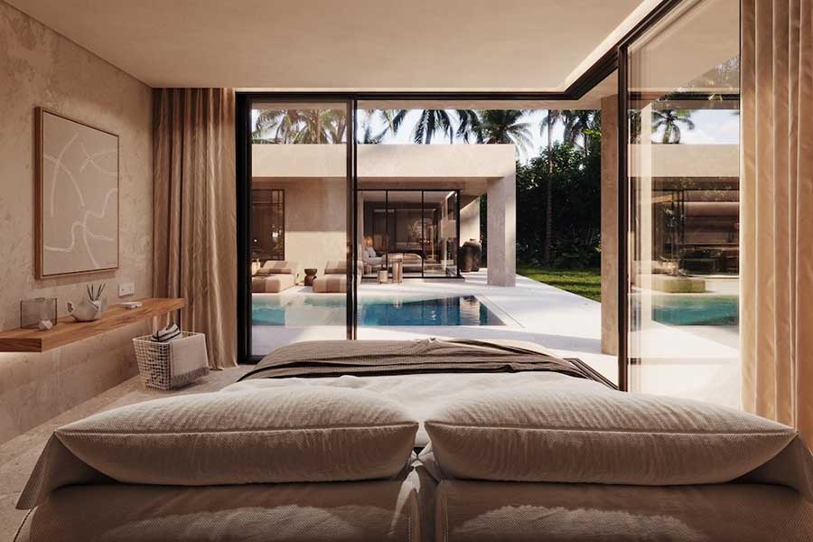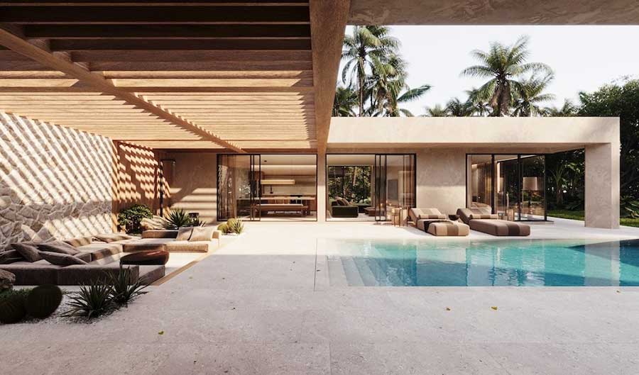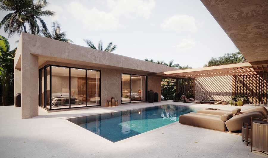 Each villa has a total build area of 297 sqm and sits on a 565 sqm land plot. The design uses calm, neutral tones and natural materials, with glazing used to bring daylight into the internal spaces without compromising privacy. Outdoor areas include a private swimming pool, terrace and a traditional sala arranged for everyday use rather than occasional entertaining.