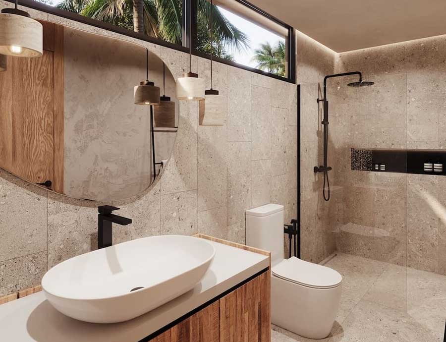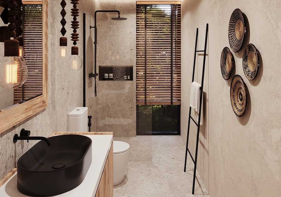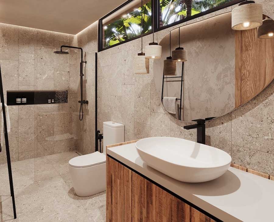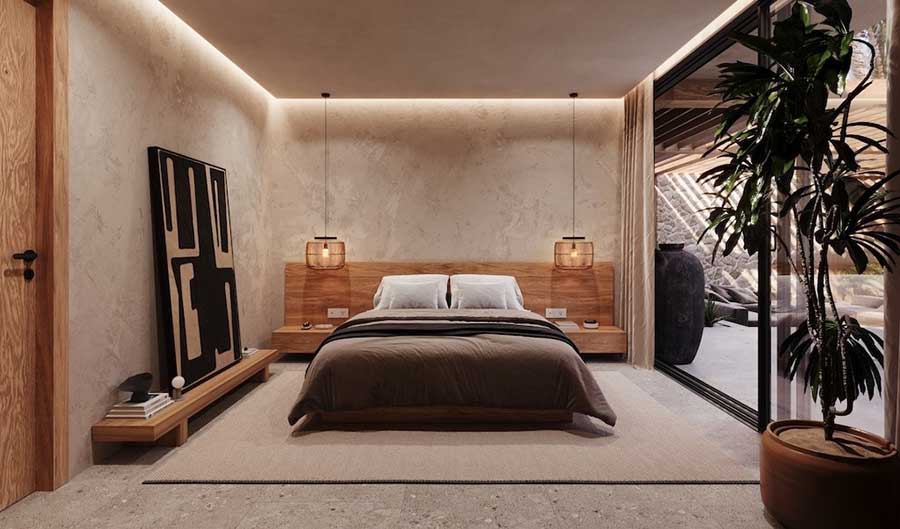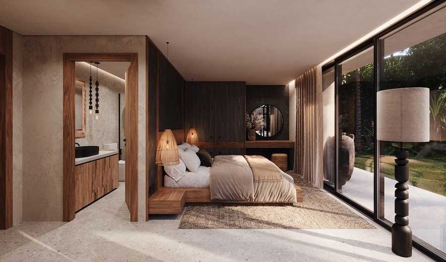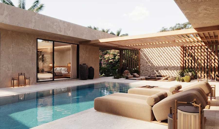 The villas use a split pavilion layout, with the outdoor living area and swimming pool positioned between two separate structures. The main pavilion houses an open-plan living, dining and kitchen area, alongside a guest bathroom and a dedicated laundry space. One ensuite bedroom is positioned next to the living area and can be accessed either internally from the lounge or externally from the terrace, offering flexibility for residents or guests.
