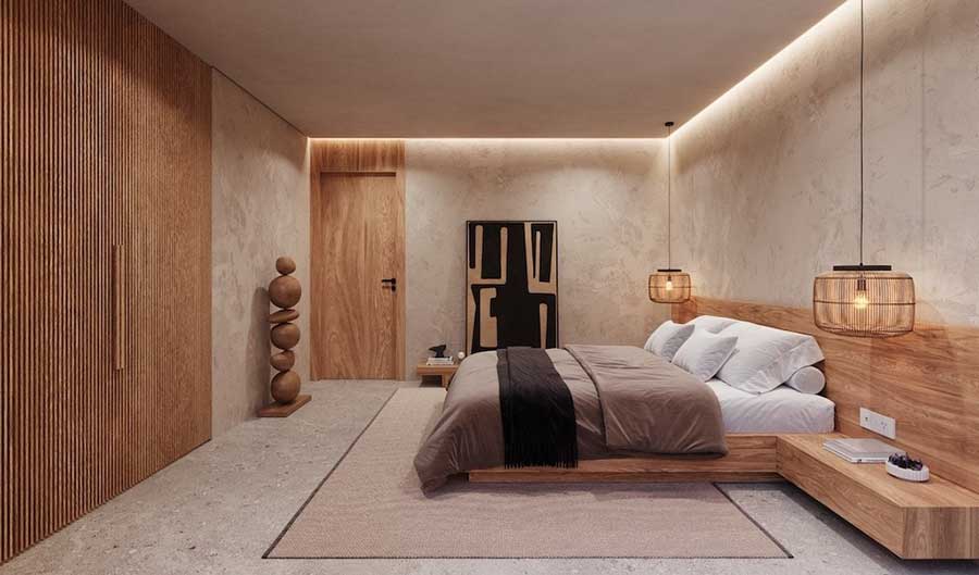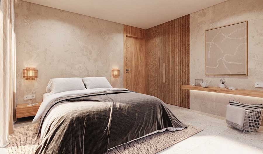 The second pavilion contains two further ensuite bedrooms, both accessed from the terrace and positioned to connect directly with the pool area. This layout allows each bedroom to maintain privacy while still opening onto the shared outdoor space. Sliding glass doors are used throughout to create a clear connection between indoor rooms, the sun terrace and the swimming pool.