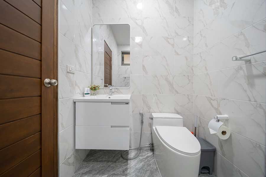 The central living and dining space features high ceilings, large sliding glass doors, and an 85-inch television with an integrated sound system. Comfortable leather seating and a marble dining table enhance the room’s clean, modern aesthetic. The adjoining Western kitchen is fully equipped with quality appliances including a built-in dishwasher, ice maker, oven, gas hob, and microwave. A separate guest bathroom serves the main living area.