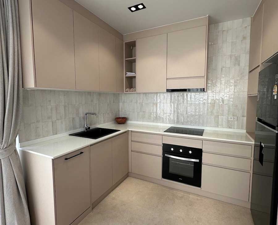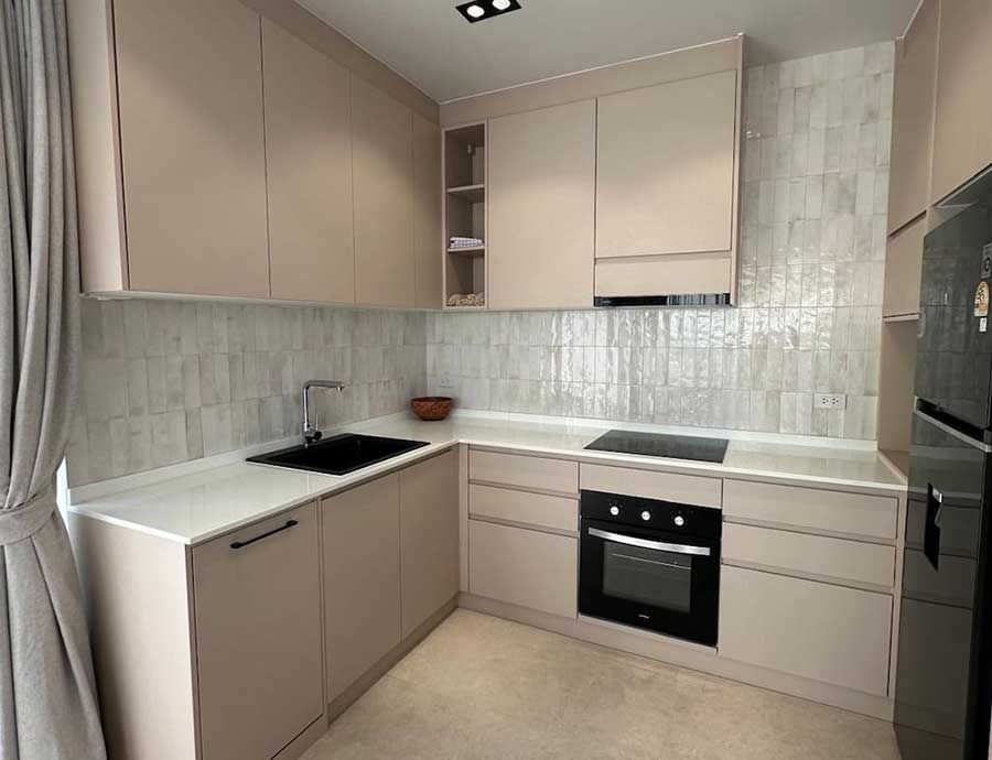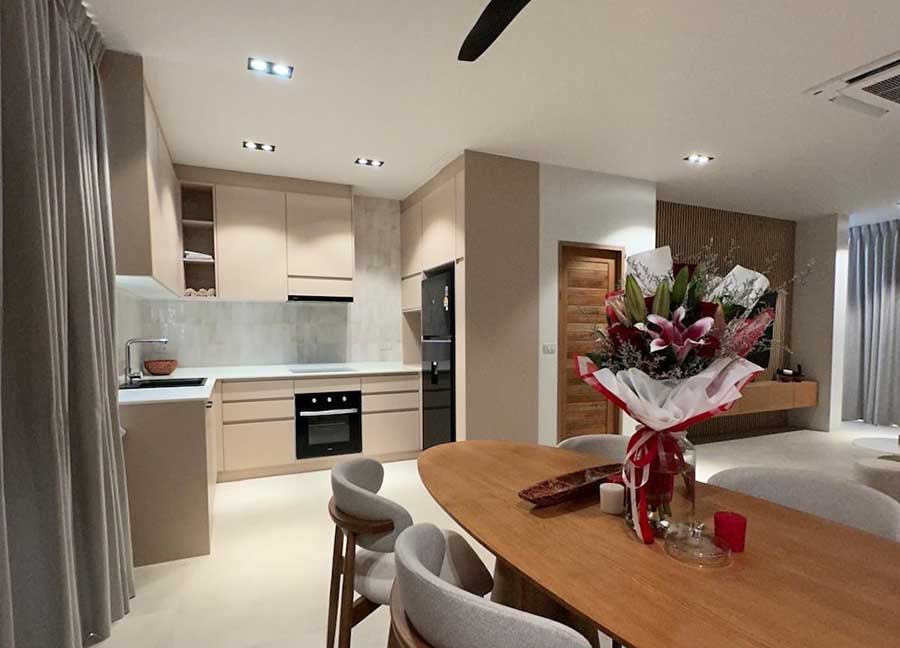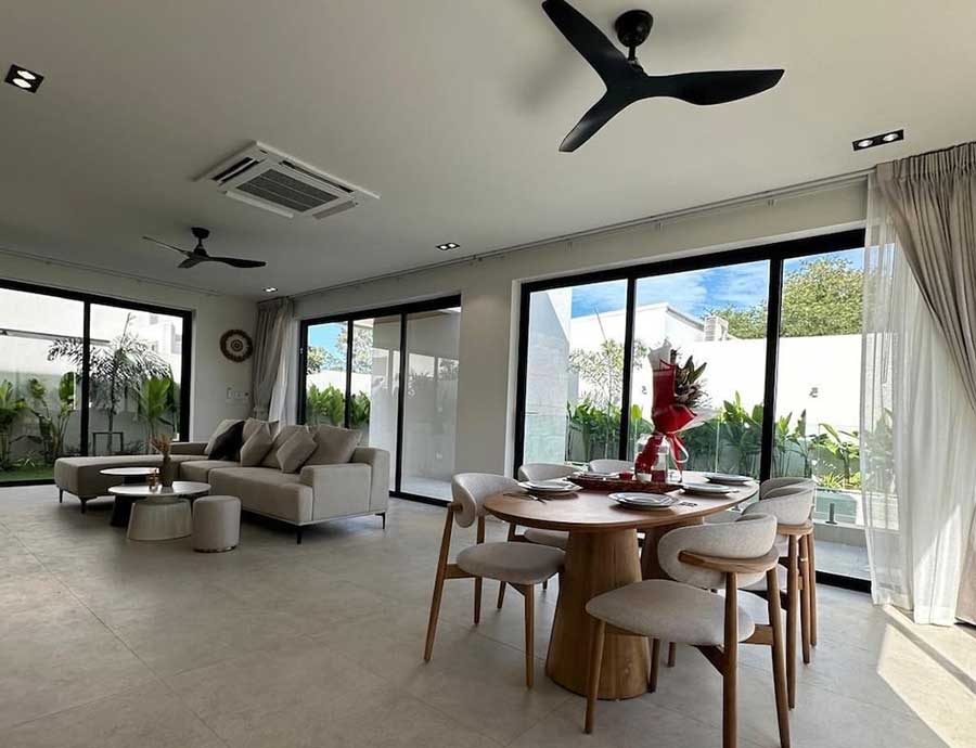 The villa spans 235 sqm across two levels. The ground floor begins with private parking and a terrace leading directly to the 24 sqm swimming pool, framed by a compact outdoor area suitable for relaxing or hosting small gatherings. Sliding glass doors connect the terrace to the main living space, where an open-plan format joins the lounge, dining area, and a western-style kitchen. The kitchen is equipped with an electric hob, oven, and fridge freezer, supported by light-toned finishes and built-in cabinetry for everyday convenience. Air-conditioning and ceiling fans ensure the space remains comfortable throughout the year.