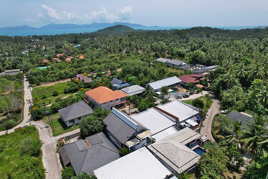 The location places the villa within a short drive of Ban Tai Beach, approximately 1.7 km away, with Mae Nam Beach around 3.7 km from the property. Fisherman’s Village in Bo Phut is approximately 9 km away, providing access to restaurants, bars, and shops. Santiburi Samui Country Club is located roughly 4 km away, and Samui International Airport is approximately 15 km from the villa. Everyday amenities including dining, massage shops, and local services are all accessible within a short drive, supporting both convenience and long-term usability.