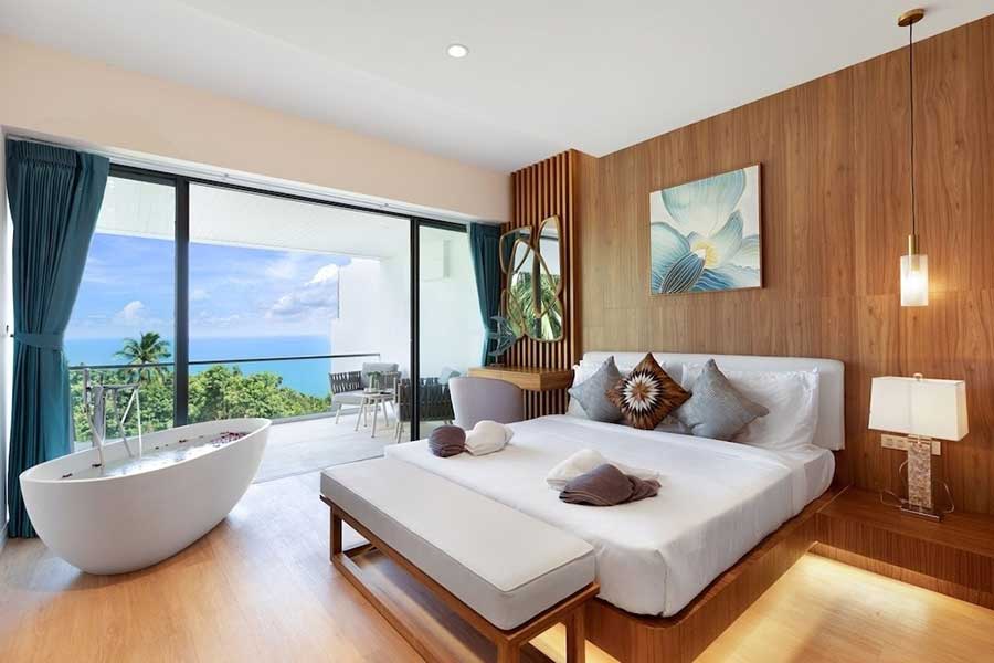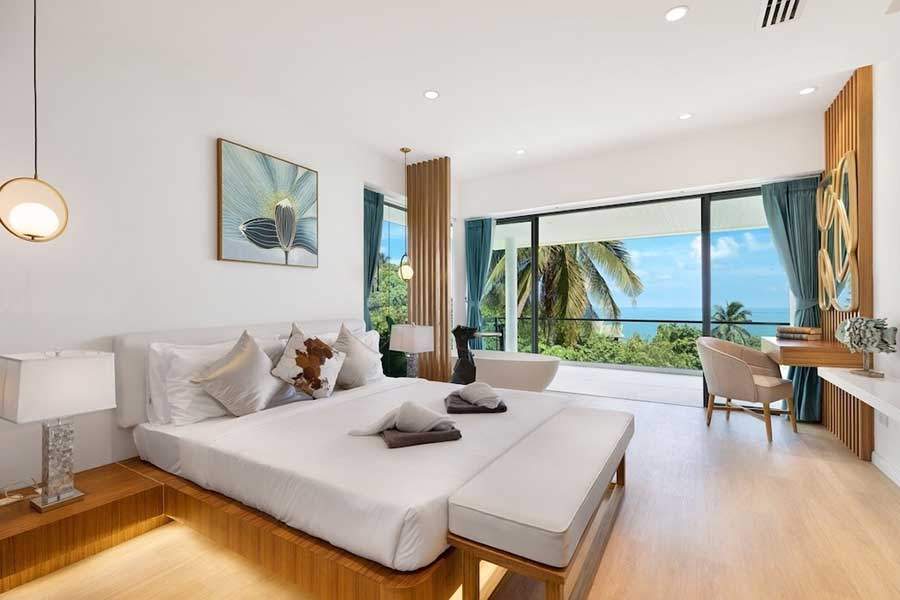 Set above Coral Cove in Chaweng Noi, this duplex villa combines a 174 sqm interior with wide sea views captured through full-height glazing across the main living spaces. Built in 2019, the layout is arranged over two levels, with the position facing directly toward the coastline to take advantage of the open outlook.