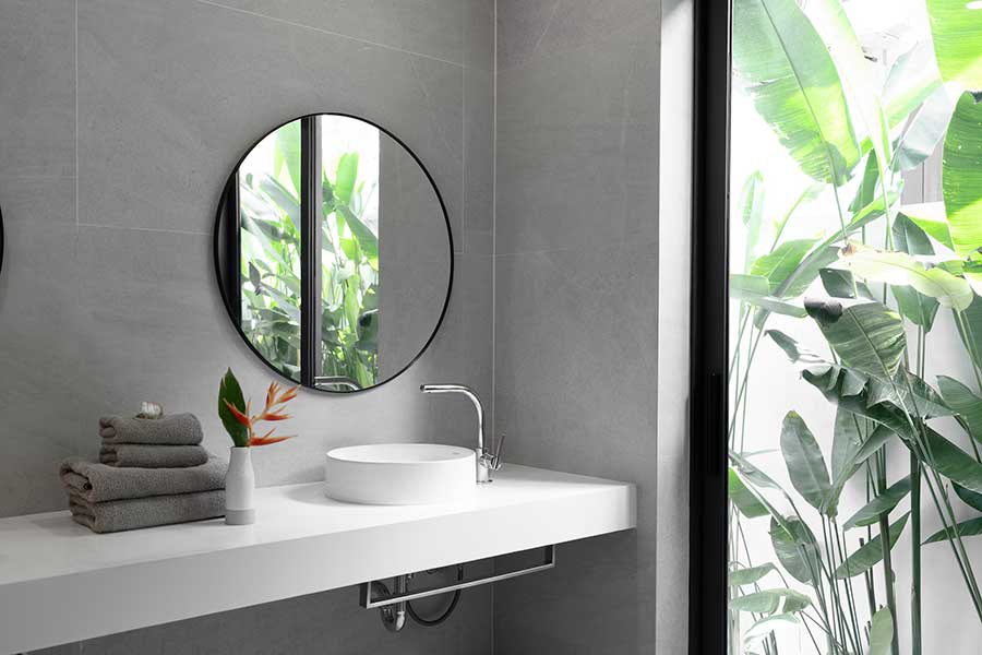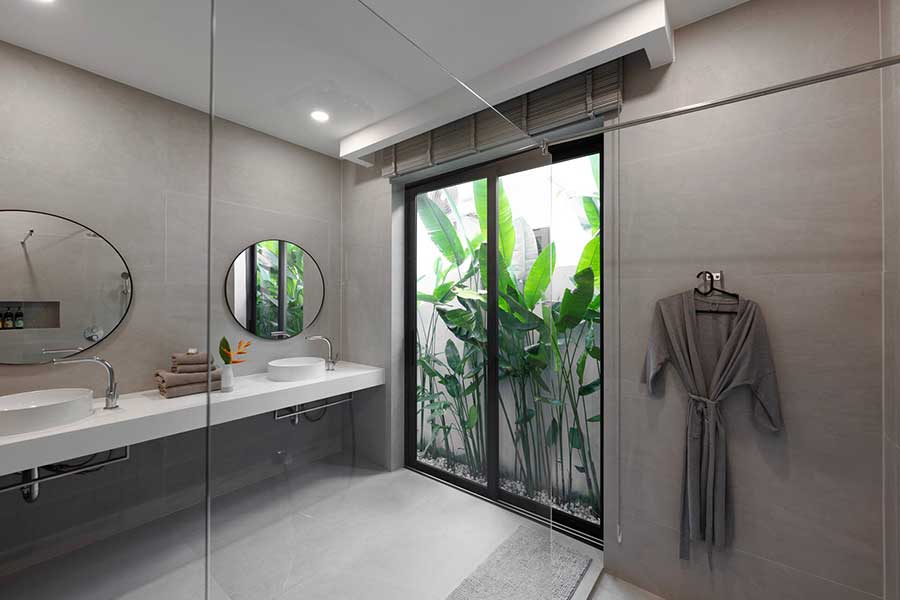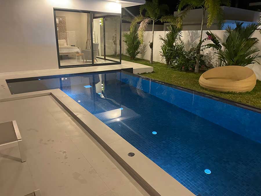 The layout follows a split-plan arrangement, with two bedrooms positioned on opposite sides of the pool-facing area. Both rooms include en-suite bathrooms, floor-to-ceiling windows, and direct access to the outdoor space. A third bedroom is located toward the rear of the property, offering additional privacy and garden views along with its own en-suite bathroom.