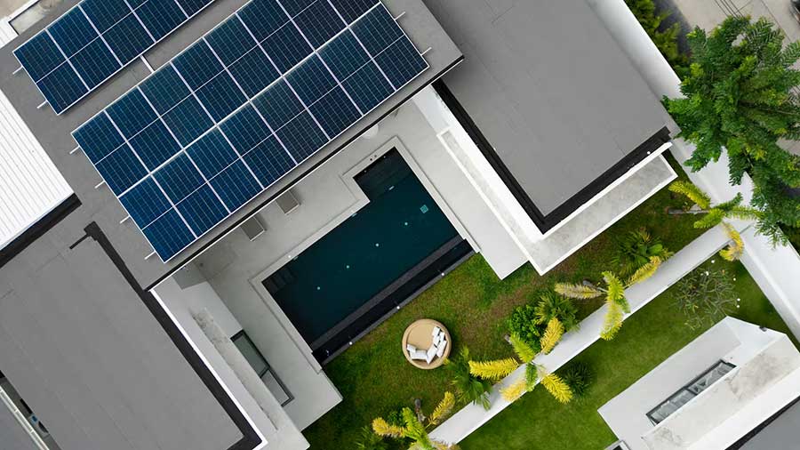 Outdoor space is centred around a private swimming pool with surrounding deck areas for seating and general use. The design allows for a direct connection between internal living areas and the pool terrace, maintaining a continuous indoor-outdoor flow. The property also includes covered parking for two vehicles, with additional space allocated for storage and laundry functions.