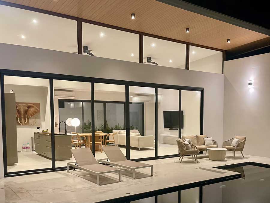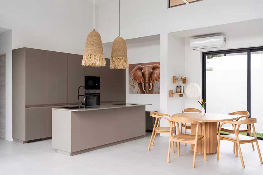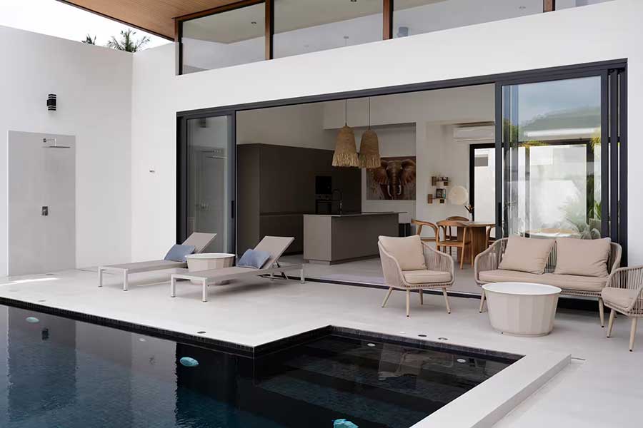 The villa is arranged across a single level, with an open-plan layout connecting the main living, dining, and kitchen areas. High ceilings increase the sense of space within the interior, while large glass panels and sliding doors provide direct access to the pool deck and garden. The kitchen is configured around a central island, supporting both everyday use and informal dining.