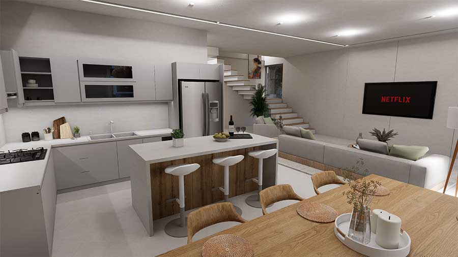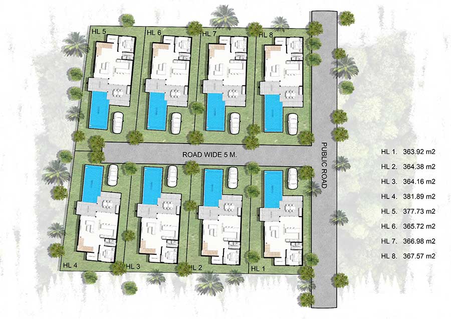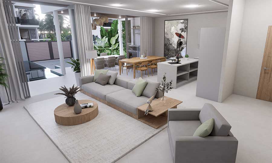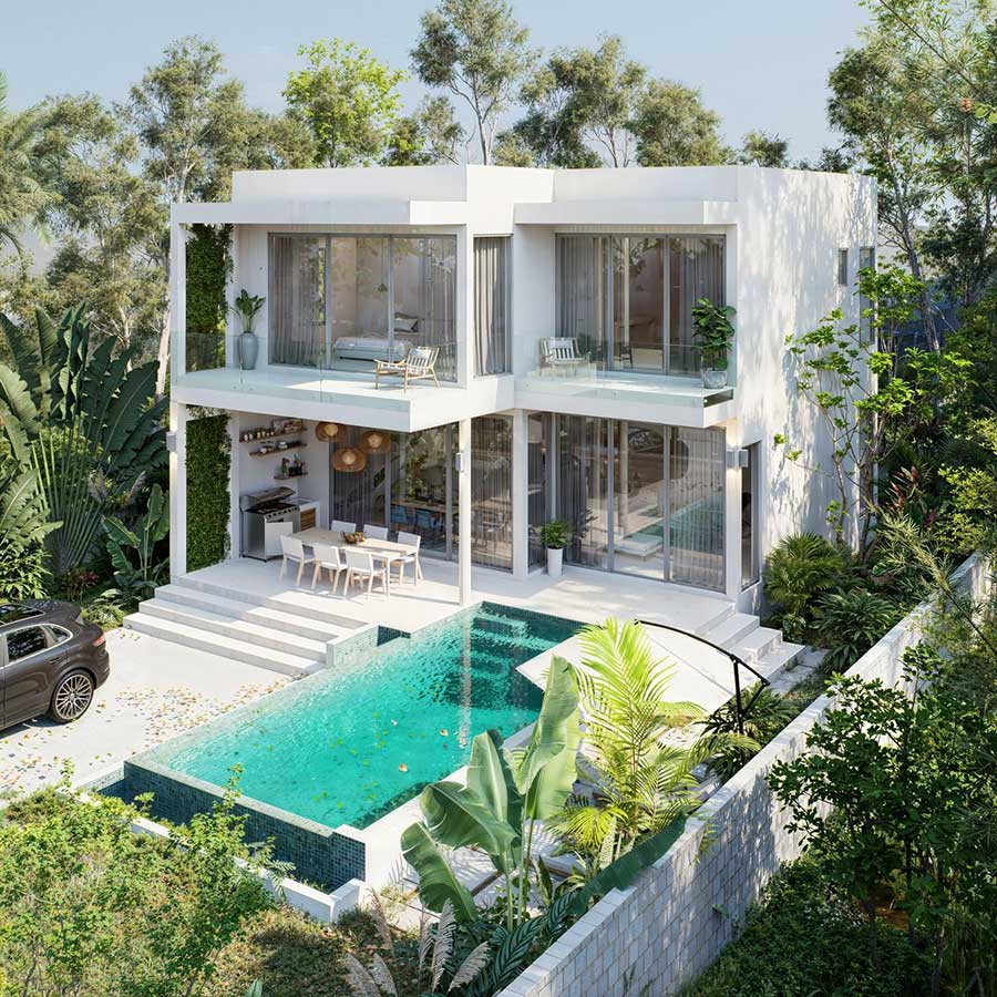 Each villa provides approximately 270 sqm of built area across a two-storey layout, set on land plots ranging from 363 to 381 sqm. The internal configuration is structured around an open-plan living and dining space, connected directly to the outdoor terrace and private pool. Large glass panels are used throughout to maximise natural light and airflow, supporting a layout that works for both full-time living and rental use.