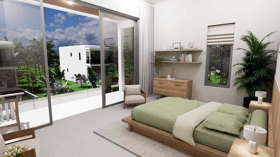 All four bedrooms are sized to allow flexible use, with each room capable of functioning as a main bedroom, guest suite, or alternative space such as an office or gym. The villas include four bathrooms, along with a separate laundry room to support practical daily use. The overall layout allows owners to adapt the space depending on occupancy, without fixed room limitations.