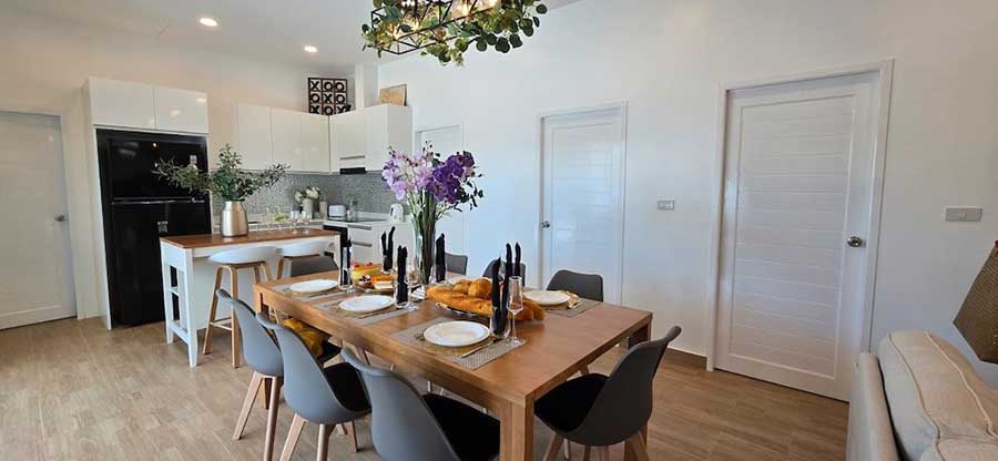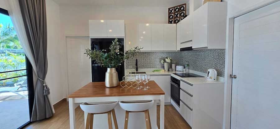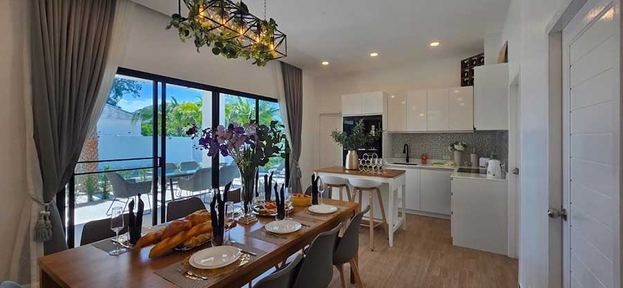 The internal layout centres around an open-plan living space that connects directly to the sun terrace and private swimming pool through full-height glazing. This arrangement allows the living areas to extend naturally outdoors while bringing daylight into the interior throughout the day. A western-style kitchen is integrated into the main living space, positioned for everyday use as well as informal entertaining.