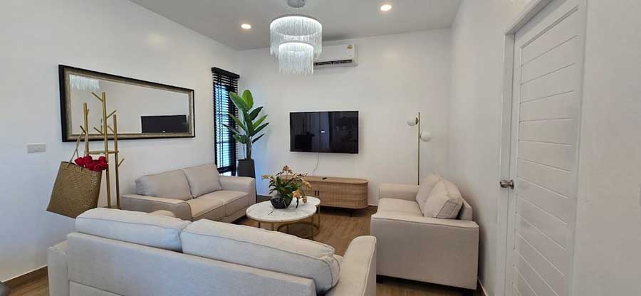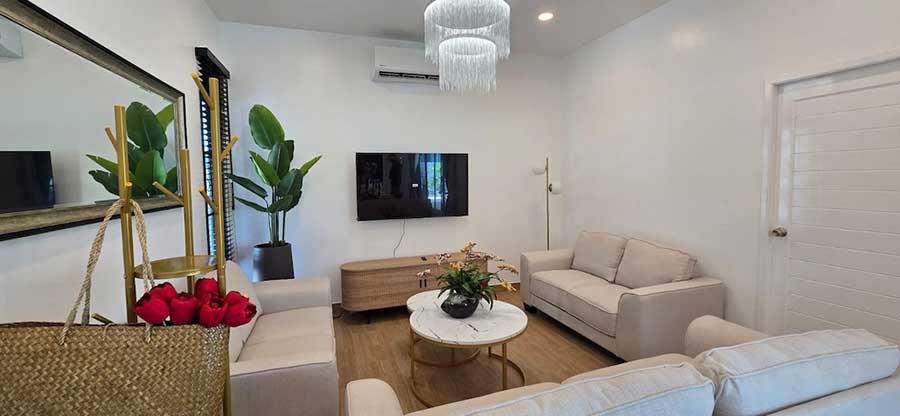 Newly completed at D2 Residence in prestigious Choeng Mon, this 4-bedroom single level garden pool villa offers 160 sqm of indoor-outdoor tropical living area. Built in 2025, the villa is arranged entirely on one level and set on a 349 sqm land plot, providing an easy-to-manage layout without internal stairs.