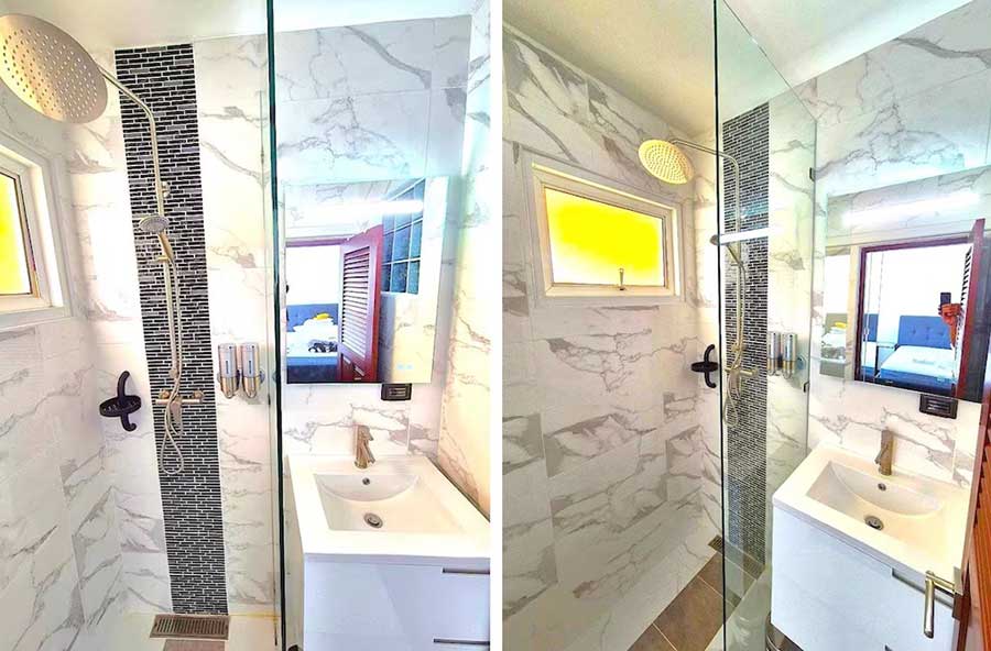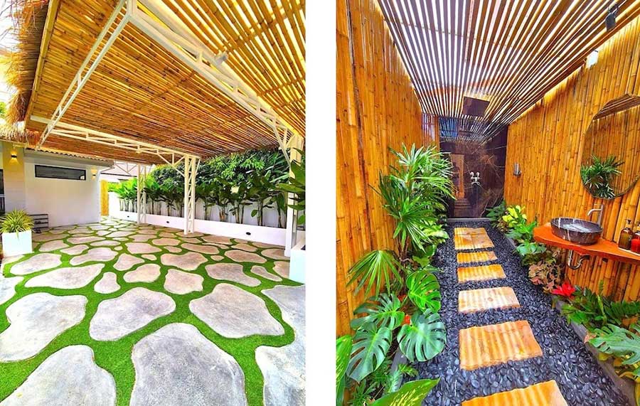 A 1.5-metre illuminated waterfall flows directly into the pool, forming the central feature of the outdoor area and creating a strong visual focal point for the terrace. Beside the pool, an 8 sqm open-air jungle shower finished in black marble and bamboo provides an additional outdoor bathing space. The two covered terraces total 40 sqm and support day-to-day outdoor use in shaded areas.