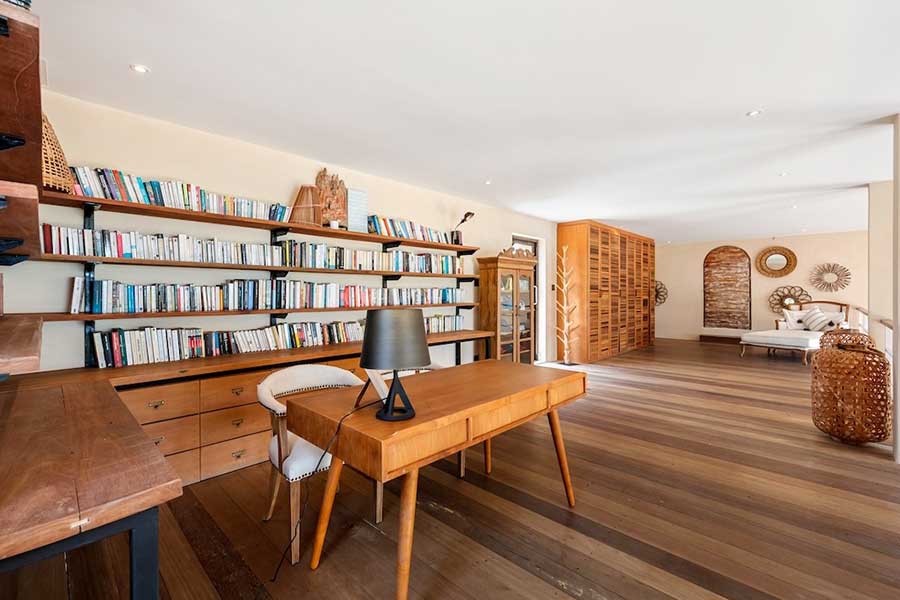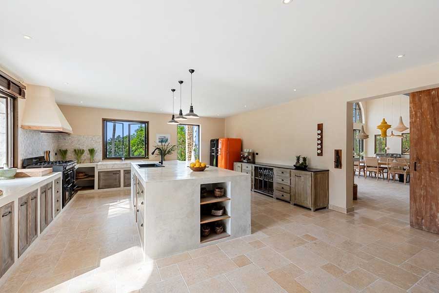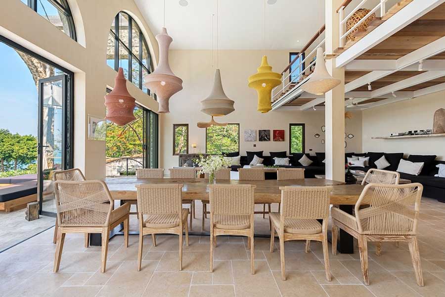 The main residence forms the centre of the estate and includes a large open-plan living and dining area with direct access to outdoor terraces. A fully equipped kitchen sits alongside this space, designed to support both everyday use and larger-scale entertaining. Additional interior features include a bar area, cinema projection setup, games area and a mezzanine level with a library and workspace.