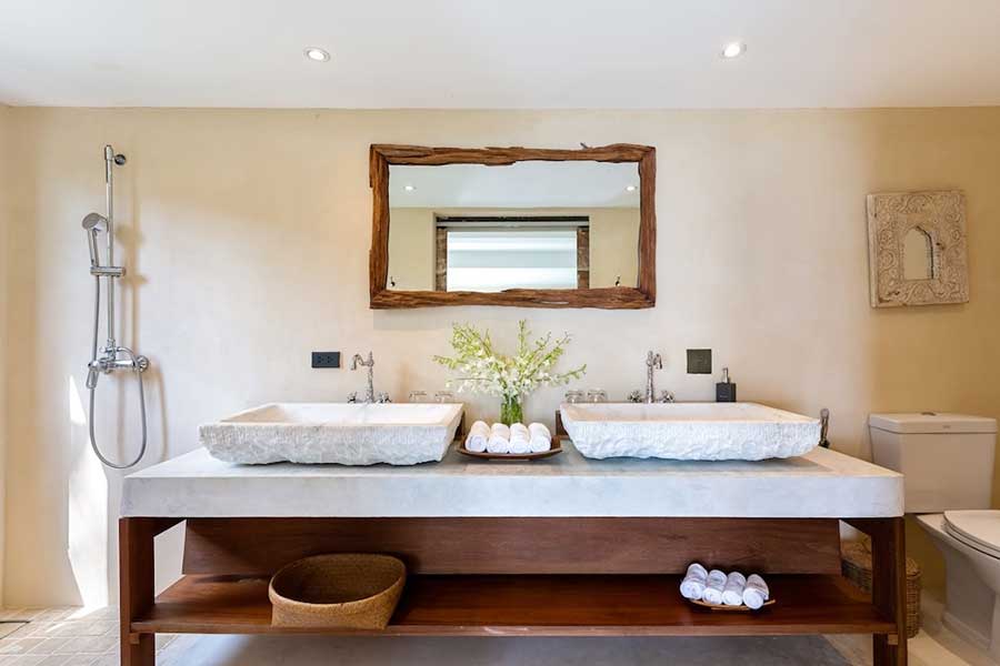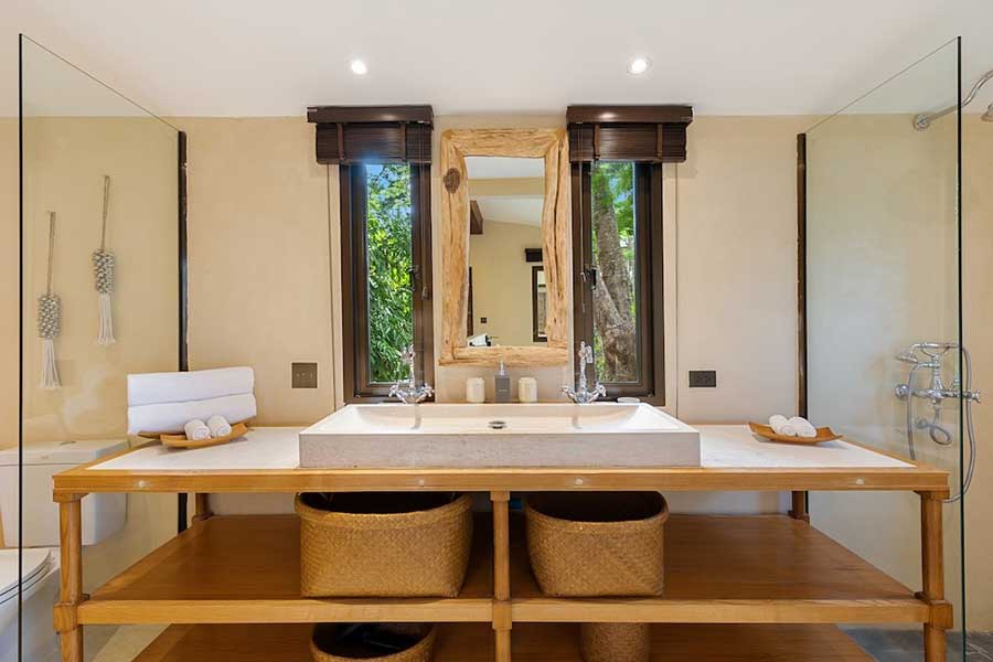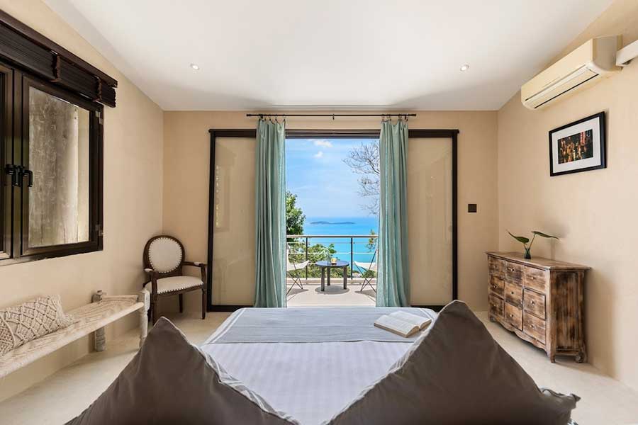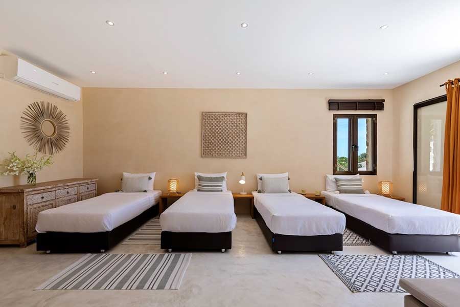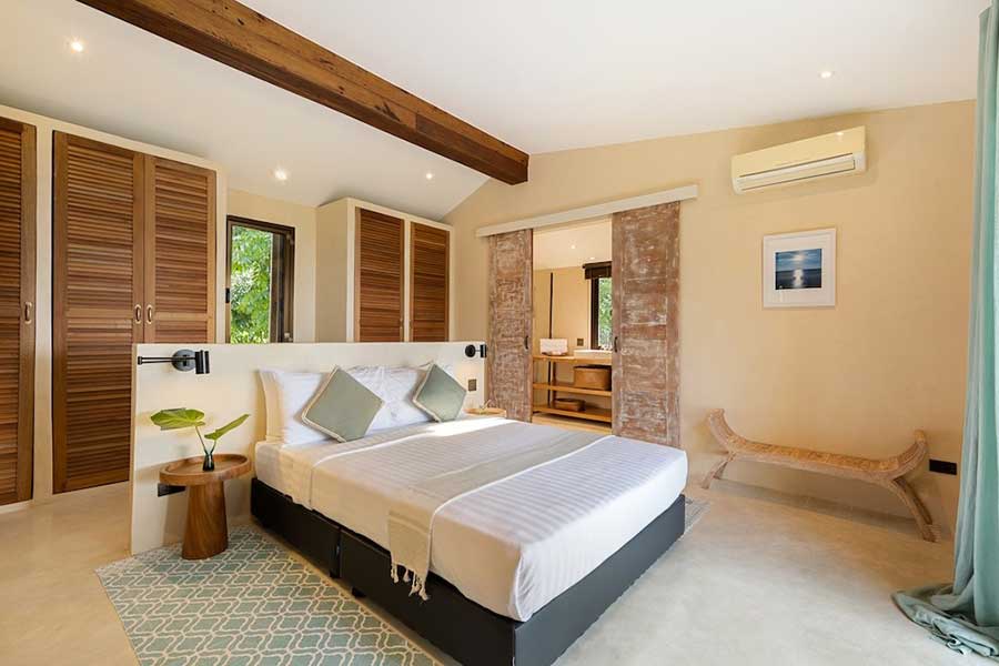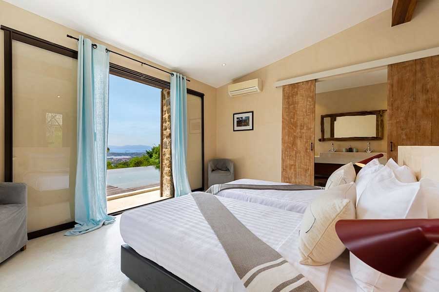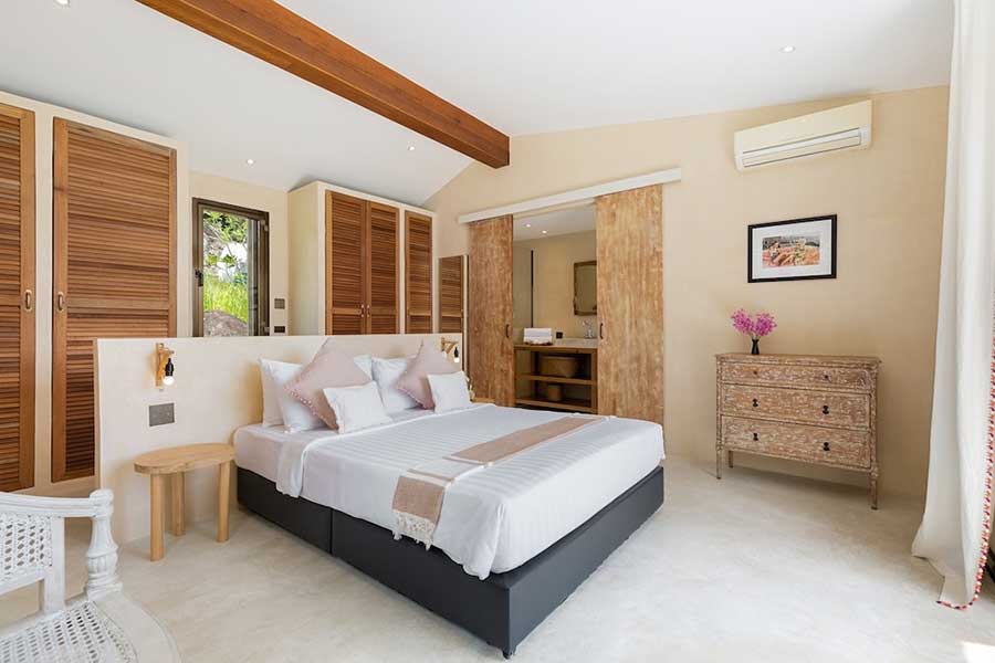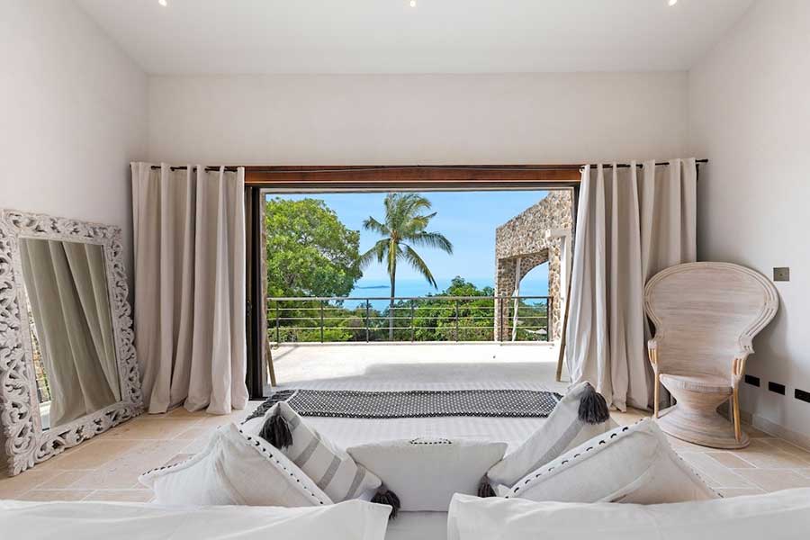 Bedroom accommodation is distributed across several standalone pavilions positioned throughout the grounds. In total, the property includes seven main bedrooms along with additional flexible sleeping areas designed for children or family use. Each bedroom includes its own en-suite bathroom, with several rooms offering direct access to terraces or garden areas. The master suite includes a private terrace and outdoor shower, positioned to take advantage of the elevated views.