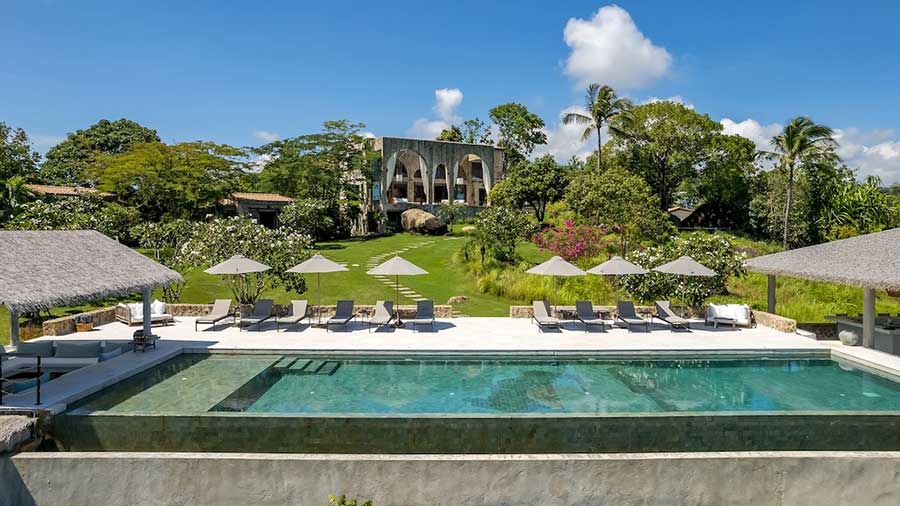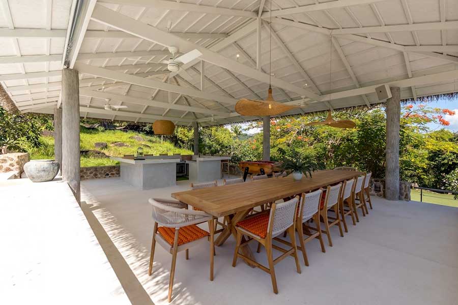 Outdoor areas are arranged across different levels of the estate, with landscaped lawns and pathways linking the buildings. The main infinity pool is positioned to face the sea, with surrounding terrace space, sun loungers and a pool bar. A second smaller pool is located beside one of the bedroom pavilions. Additional outdoor features include multiple dining areas, a dedicated event deck, a putting green, pétanque court and shaded lounge spaces.