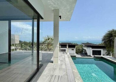 Positioned in the hills above Bo Phut, this three-bedroom Koh Samui villa captures wide ocean views from an elevated location. Set within a private residential enclave, the property offers a quiet living environment just minutes from beaches, cafés, and Fisherman’s Village.