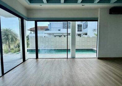 The ground floor centres around a spacious, open-plan living area, with full-height glass sliding doors that open to the pool and terrace. The layout is ideal for indoor-outdoor living in a tropical climate.