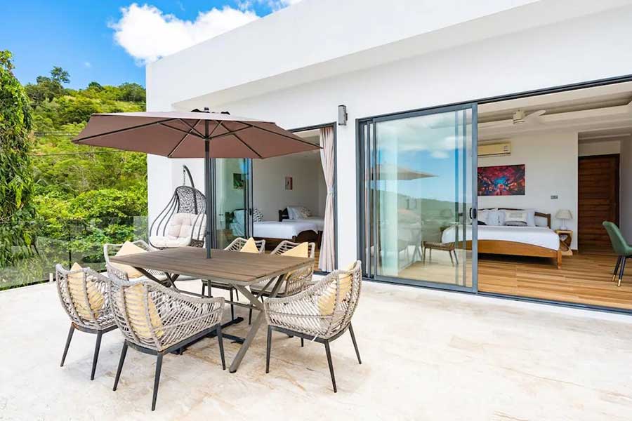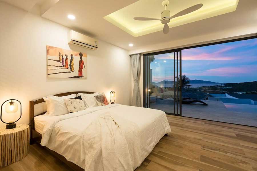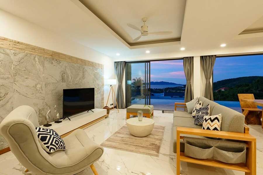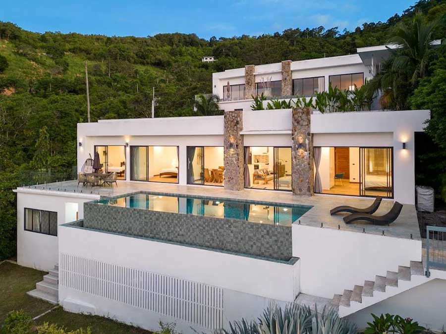Set within the Bo Phut Hills, this contemporary 4-bed sea view villa offers elevated views across the coastline along with a layout designed for both residential living and rental use. The property combines clean architectural lines with stone detailing and wide terraces that frame the surrounding sea and tropical landscape.