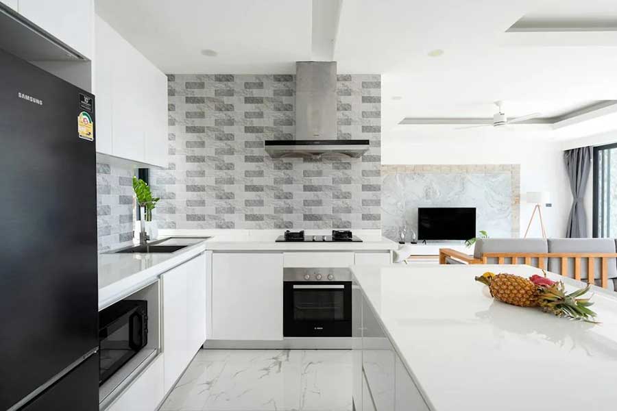 The main living space is arranged as an open-plan area, integrating lounge, dining, and kitchen functions into a single connected environment. Large sliding glass doors open directly onto the pool terrace, allowing natural light and airflow throughout the interior. The kitchen is finished in a modern white design with a central island, providing both preparation space and informal seating, while air-conditioning and ceiling fans are installed to support year-round use.