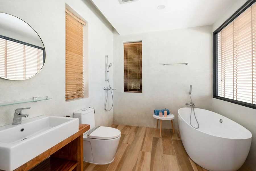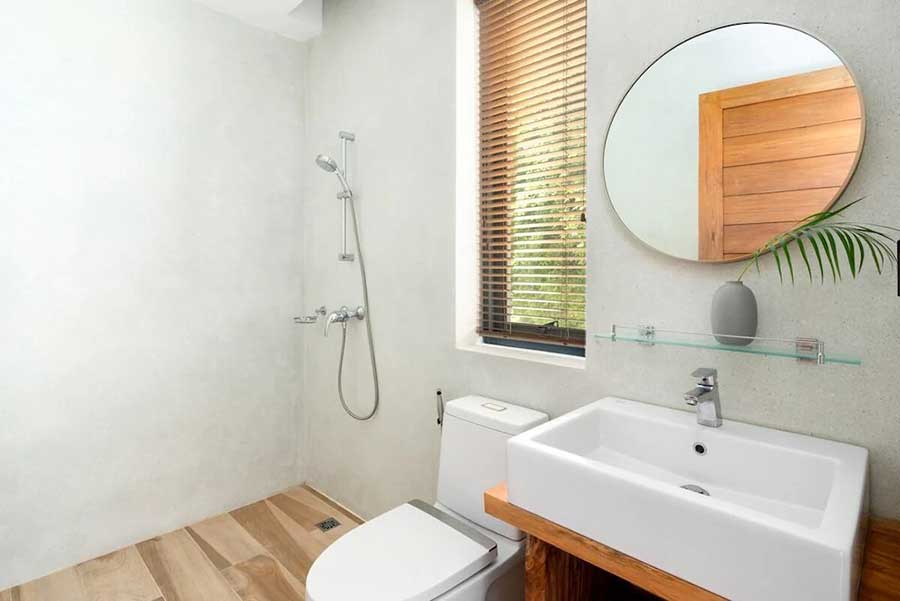 Three of the bedrooms are positioned on the main level, each with direct access to the pool terrace through sliding doors. These rooms are configured to maintain privacy while remaining connected to the outdoor space. Bathrooms include walk-in showers and bathtubs. The fourth bedroom is located on the lower level with access to the garden, providing separation from the main living areas and suitable use as a guest or secondary suite.