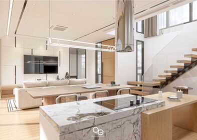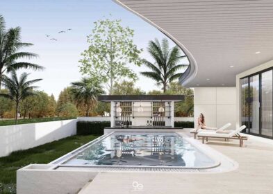 The architecture is clean-lined and contemporary, with cool white tones, soaring ceilings and an open plan design that draws natural light throughout the interior. Floor-to-ceiling glazing frames uninterrupted sea views across Chaweng Bay towards the surrounding mountains, jungle and Coral Cove Bay. The layout is designed for seamless indoor–outdoor living, with the main living zone opening to the terrace, infinity pool, pergola deck, sun terrace and garden.